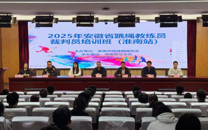 4月12日至13日,由安徽省毽球跳绳协会、淮南市毽球跳绳协会主办,淮南师范学院承办的2025年安徽省跳绳教练员裁判员培训班(淮南站)在淮南师范学院知明湖报告厅成功举办。培训班特别邀请了全国培训导师、国家级裁判员、安徽省跳绳赛事裁判长武飞和全国培训导师、高级教练员王寅吉进行授课。安徽省毽球跳绳协会秘书站王心永、副会长杨琴、淮南师范学院体育学院党委书记葛士顺、淮南市毽球跳绳协会会长李涛出席了开班仪式。