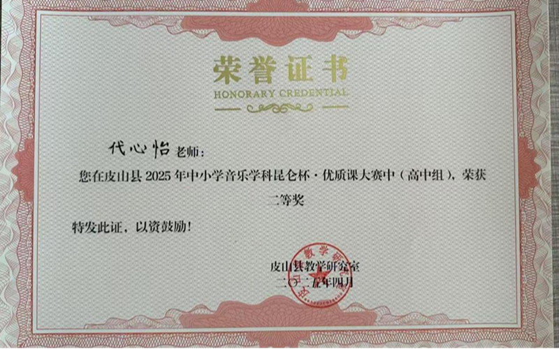 近日,在皮山县2025 年中小学音乐学科昆仑杯·优质课大赛(高中组)中,淮南师范学院第五批援疆支教团成员音乐学院代心怡同学脱颖而出,荣获二等奖,为学校和个人争得荣誉。