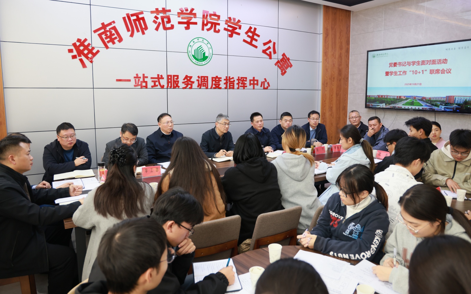 10月21日,党委书记与学生面对面暨学生工作“10+1”联席会议在淮南师范学院“一站式”学生社区调度中心召开。校党委书记阮爱民亲切会见了学生代表,并与相关职能部门负责人一同,围绕学生成长成才和学校发展建设进行了深入、坦诚交流。校党委常委、副院长孙大军主持会议。