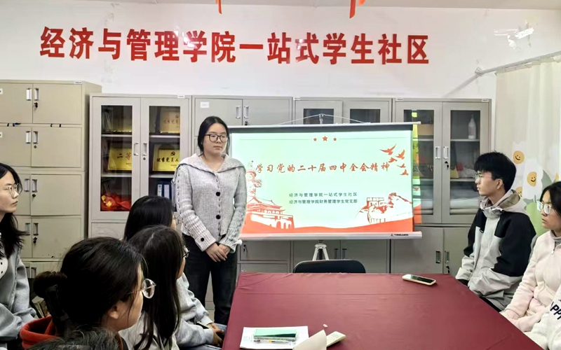 为推动党的二十届四中全会精神入脑入心,引导青年学生将思想和行动统一到全会精神上来,11月5日,财务管理专业学生党支部在“一站式”学生社区开展党的二十届四中全会精神学习分享活动。活动由党支部书记章卫敏主持,支部党员和部分入党积极分子参会。