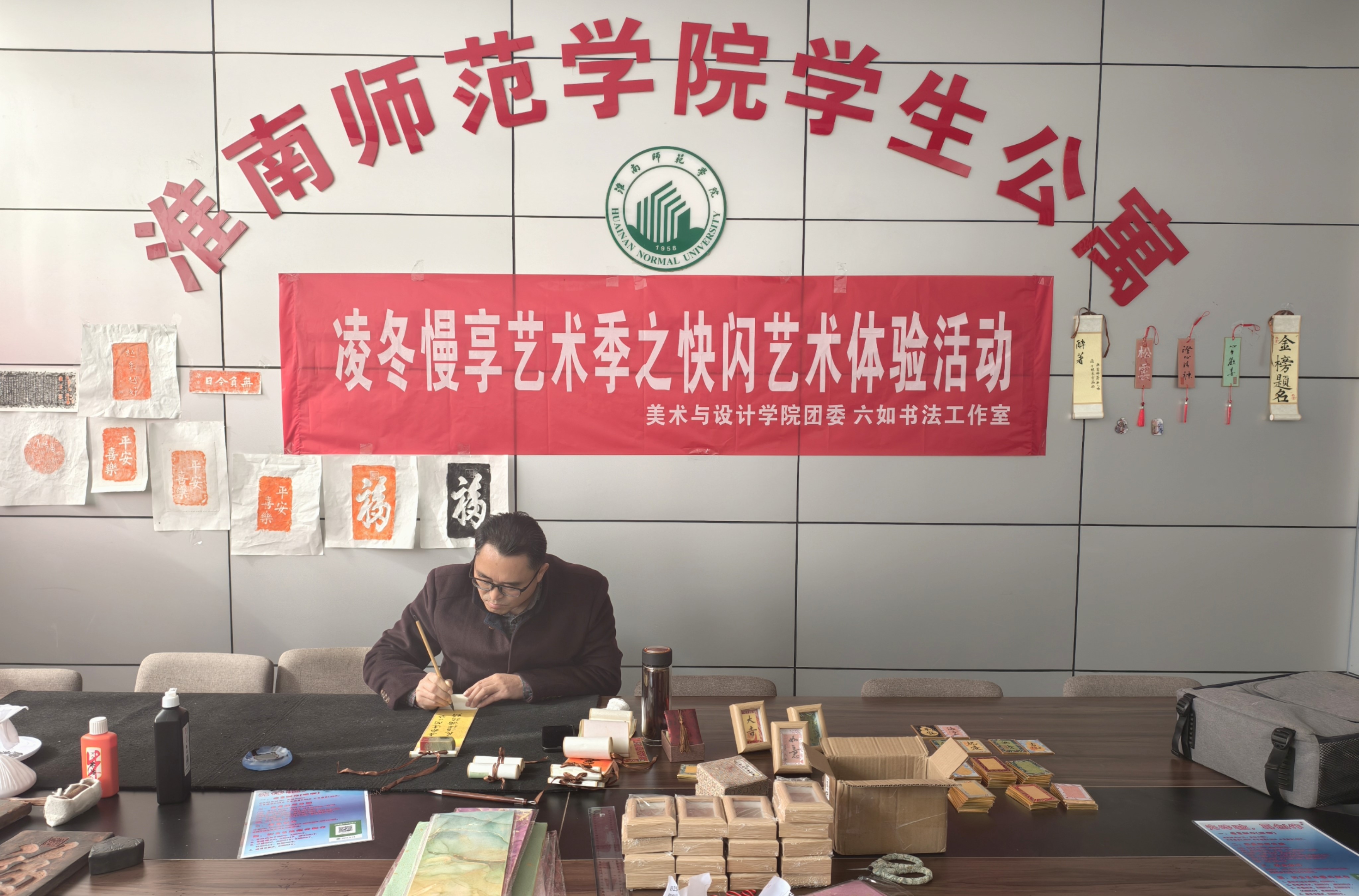 为丰富校园文化生活,落实美育育人理念,让师生在实践中感受艺术魅力、传承文化基因,11月23日下午,由美术与设计学院团委、六如书法工作坊联合主办的“凌冬慢享艺术季之快闪艺术体验集市”在学校一站式服务中心温情启幕,美术与设计学院副院长、六如书法工作坊指导老师陈大利现场指导。全校师生踊跃参与,在亲手创作中暂离紧张学习节奏,收获专属冬日温暖与艺术感悟。