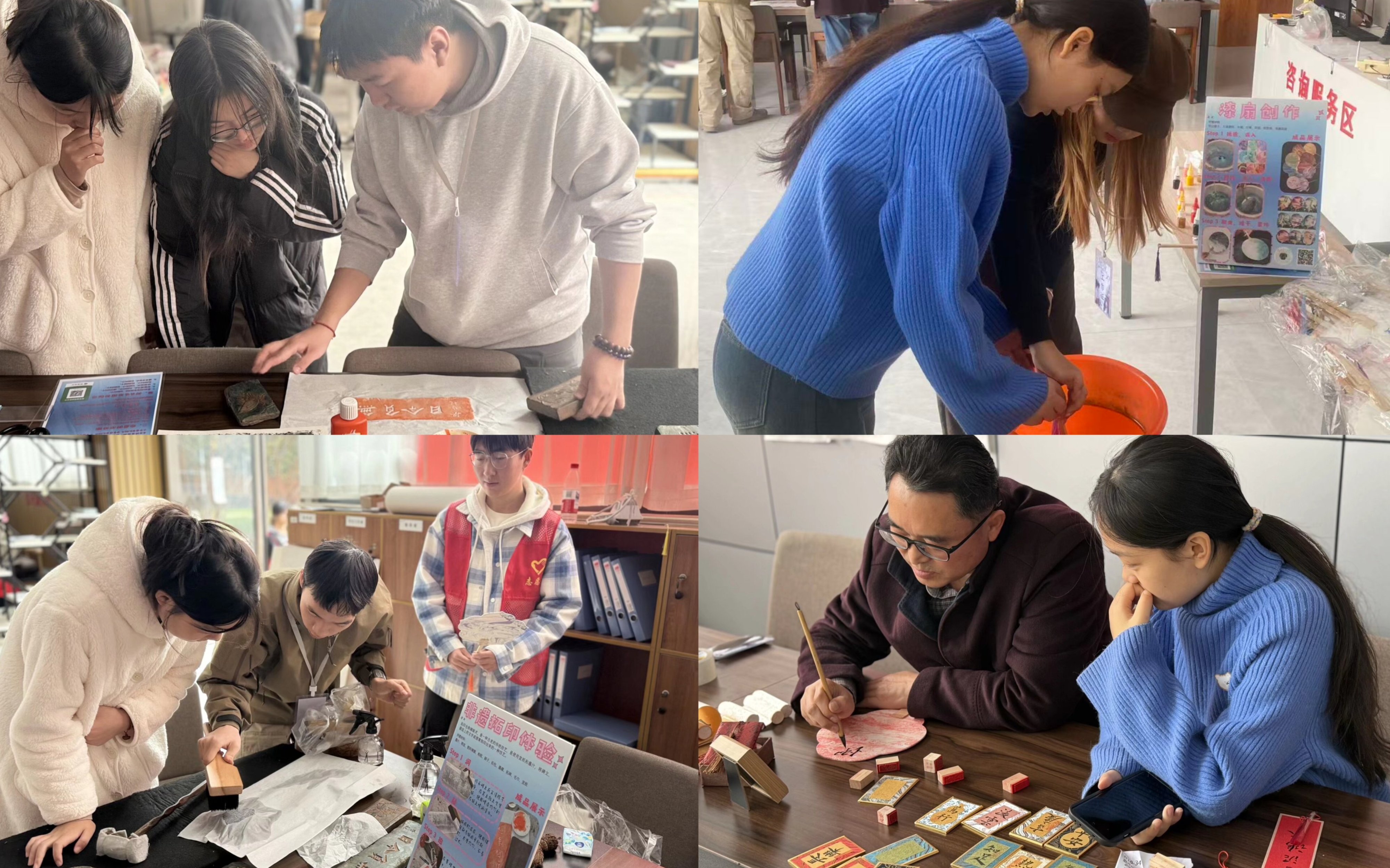 本次集市以“慢享冬日艺术,手作专属温暖”为主题,聚焦传统与创意的融合,精心设置四大核心体验项目,将美育实践融入趣味手作之中。“银杏吧唧”像章DIY摊位前,师生们围绕银杏叶独特纹理,自由搭配文字、印章与排版,在方寸之间勾勒创意,经过装裱封装后,一个个兼具观赏性与收藏价值的微型艺术作品应运而生;非遗拓印体验区更是人气爆棚,10块经典碑刻拓片版材整齐陈列,书法专业同学现场指导铺纸、洒水、拓印的完整流程,让师生在亲手操作中触摸历史印记,感受非遗文化的厚重底蕴,装裱服务更让这份文化记忆得以长久留存;漆扇创作区里,大家自选扇形与漆色,通过浇注、晕染等手法制作“情绪漆扇”,每一笔色彩晕染都承载着创作者的心境,成品既是实用配饰,亦是独一无二的艺术表达,题字盖章服务更添专属仪式感。