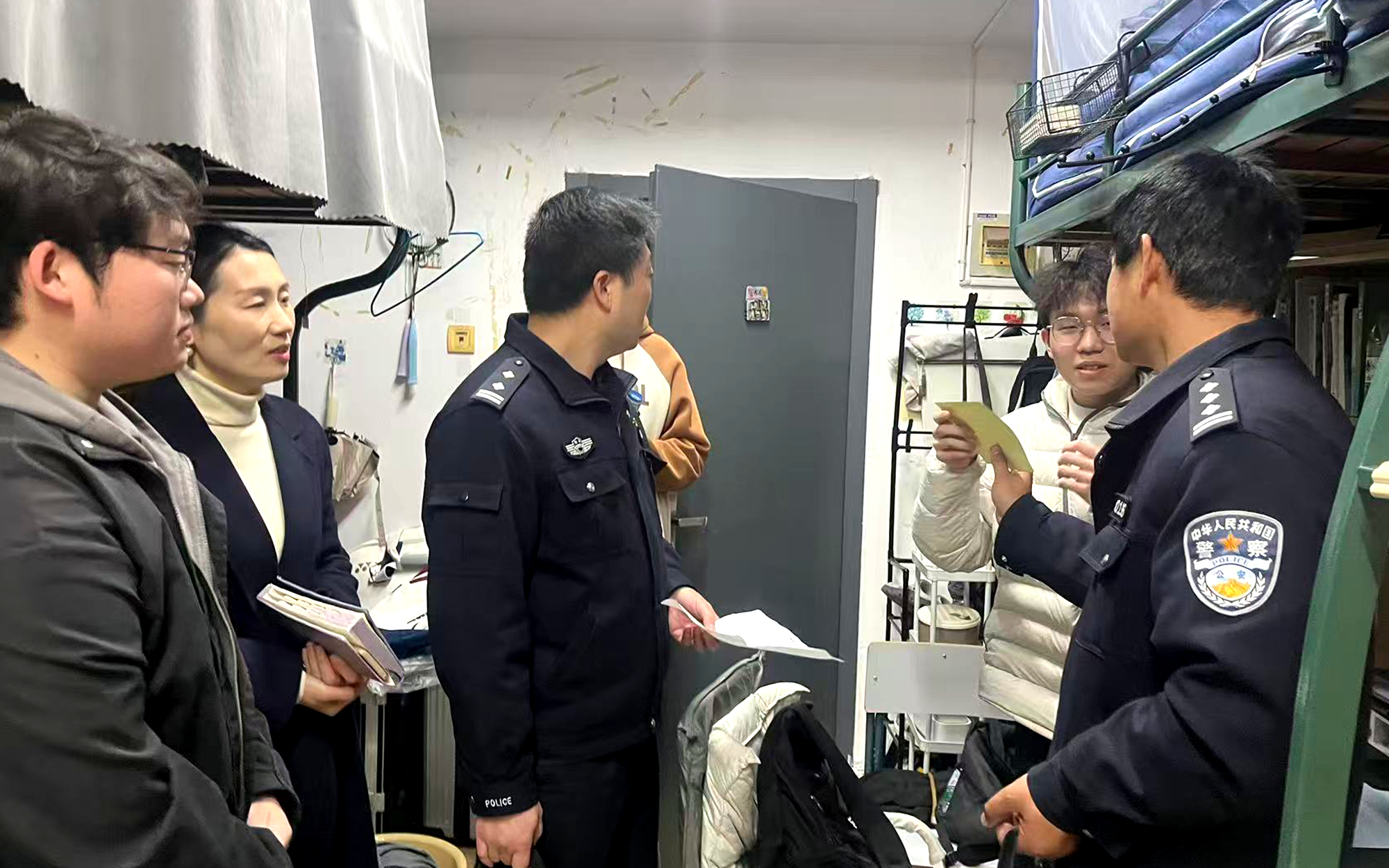 集中宣讲结束后,民警与到场领导、老师组成专项宣讲小队,深入五单元学生宿舍进行走访。针对常见的“陌生快递信息核实”等常见风险,民警用通俗易懂的语言进行精准提示,并结合典型案例讲解防范技巧,让防诈知识更加贴近实际生活。宣讲小队还向每间宿舍发放《反诈小贴士》卡片,在宿舍门、公告栏等醒目位置张贴“防诈警示”,着力营造“时时有提醒、处处有警示”的防诈环境。