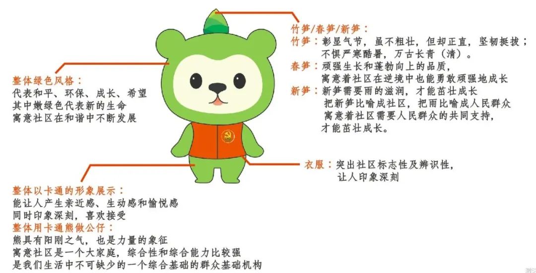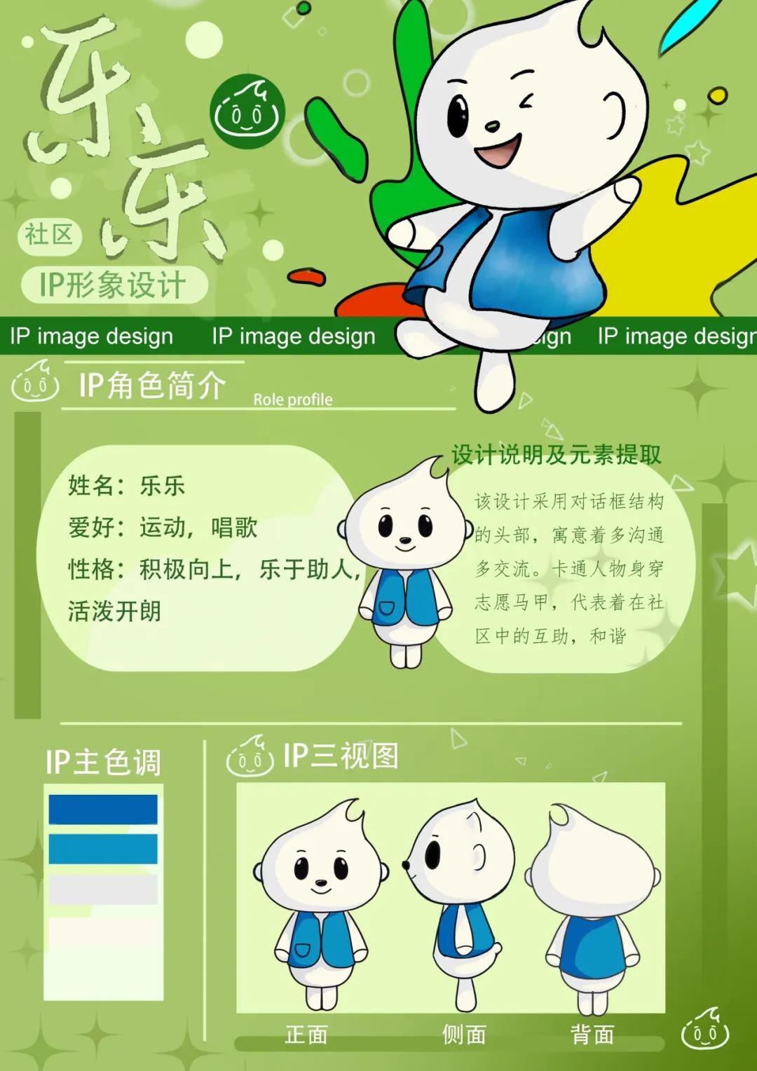 IP形象根据社区精神创建,人物头部采用对话框形式,代表着多沟通多交流,人物穿志愿马甲,代表着社区中的志愿精神、互助精神。