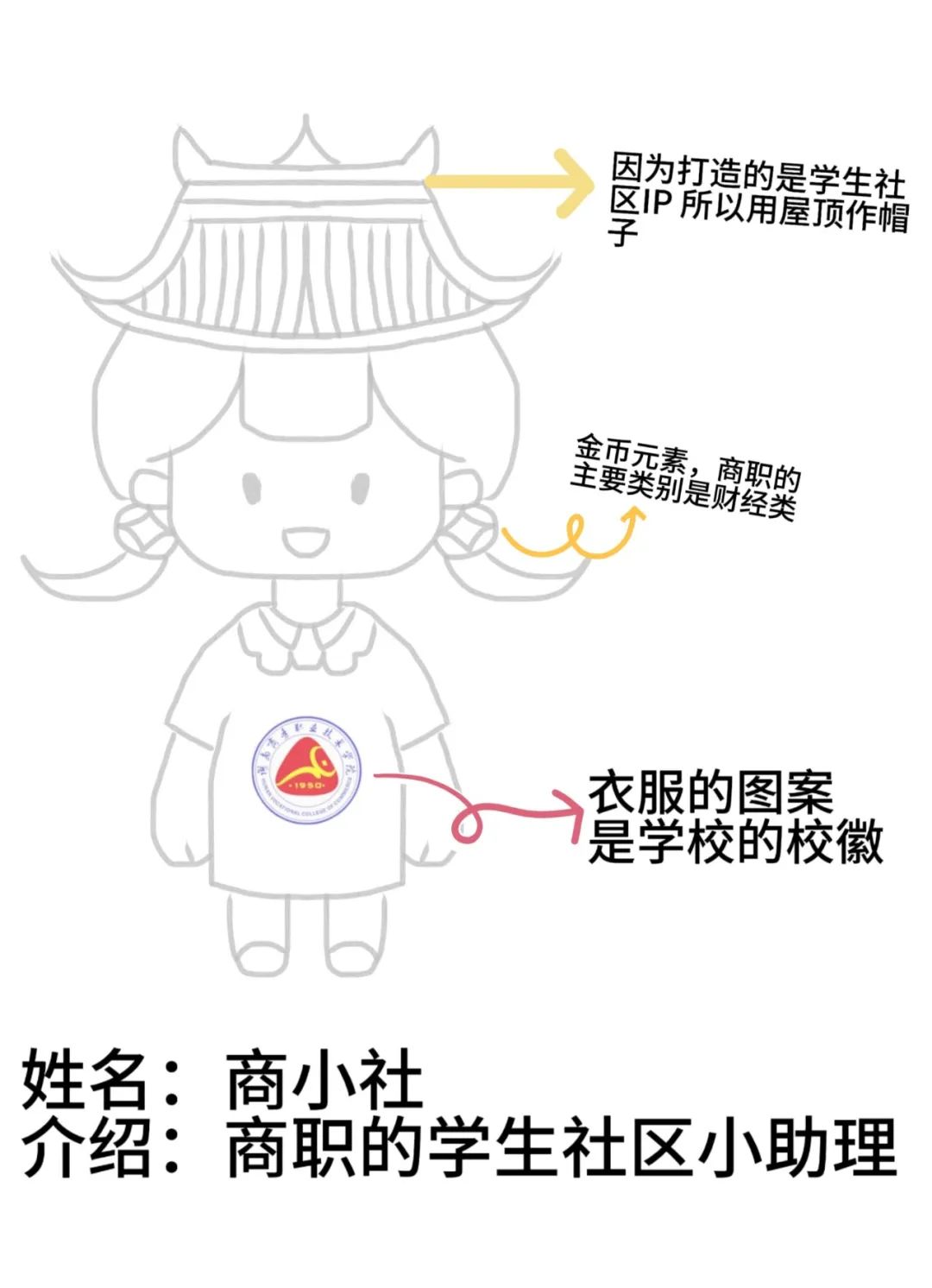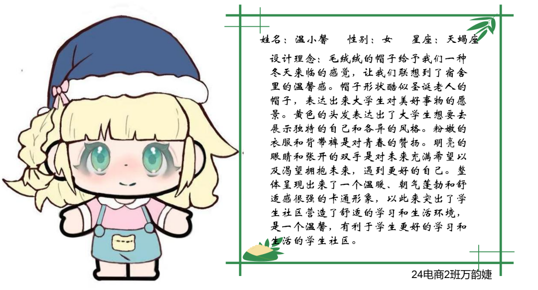 毛绒绒的帽子给予我们一种冬天来临的感觉,让我们联想到了宿舍里的温馨感。黄色的头发表达出了大学生想要去展示独特的自己和各异的风格。粉嫩的衣服和背带裤是对青春的赞扬。明亮的眼睛和张开的双手是对未来充满希望以及渴望拥抱未来,遇到更好的自己。整体呈现出来了一个温暖、朝气蓬勃和舒适感很强的卡通形象,以此来突出了学生社区营造了舒适的学习和生活环境,是一个温馨且有利于学生更好的学习和生活的学生社区。