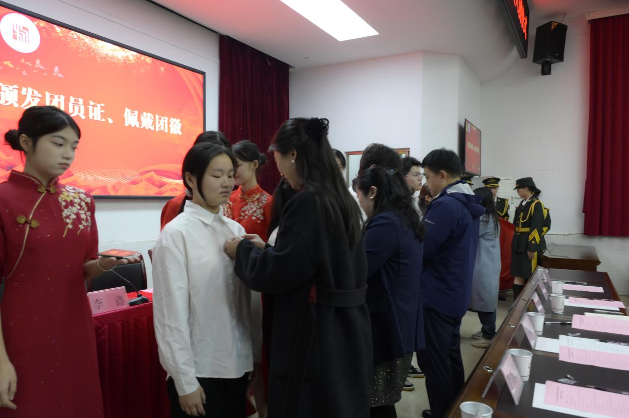 参会老师为新团员佩戴团员徽章、颁发团员证