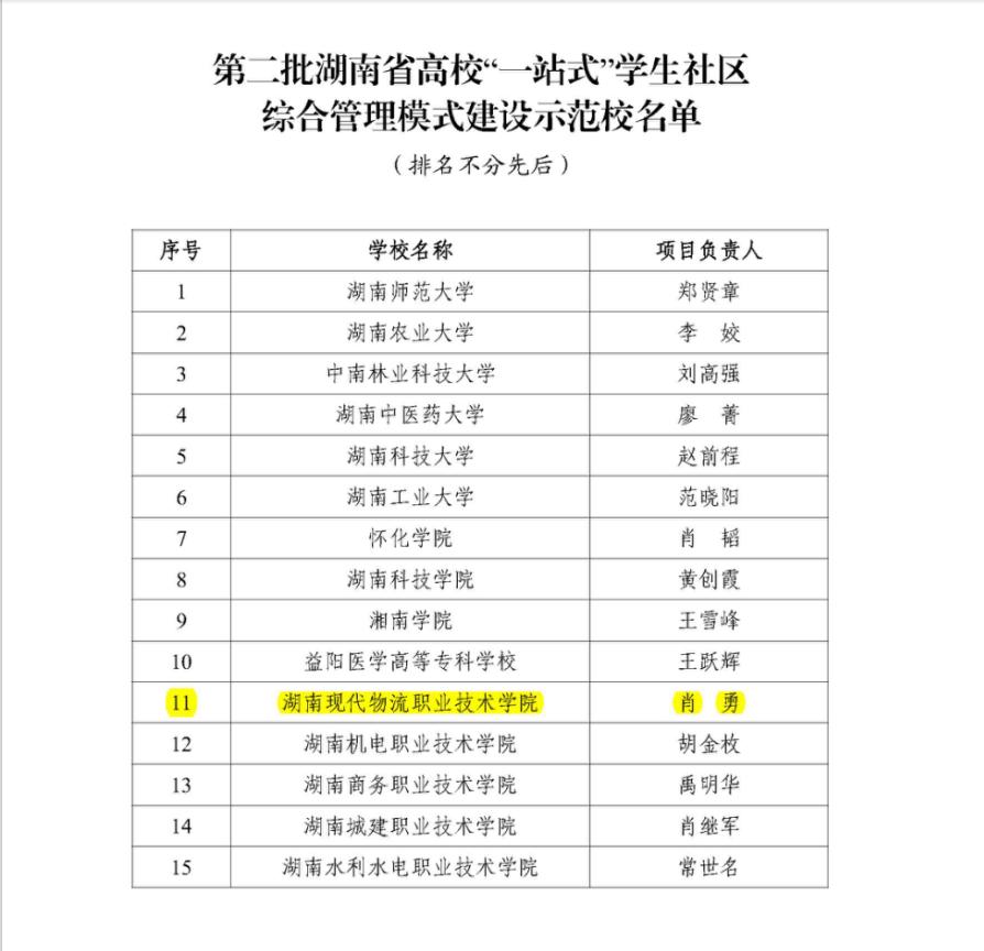 近日,中共湖南省委教育工作委员会发布通知,公布了第二批湖南省高校“一站式”学生社区综合管理模式建设示范校名单。经过学校申报、资格审核、专家评审等多轮环节,我校凭借在学生社区建设方面的扎实工作与特色实践,成功入选该批次示范校,成为全省获此殊荣的15所高校之一。