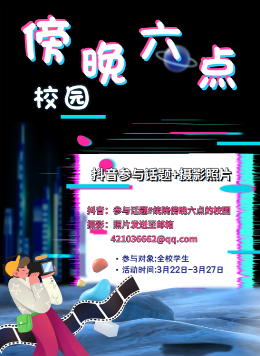 3月22号,“傍晚六点的校园”摄影比赛开拍。“学生之家”精心组织了一场关于“抖音参与话题#统院傍晚六点的校园”的摄影比赛。活动期间,同学们可以将自己的摄影作品发到邮箱中进行投稿,投稿的的同学可以在3月27号足球场上兑换精美的小礼品。