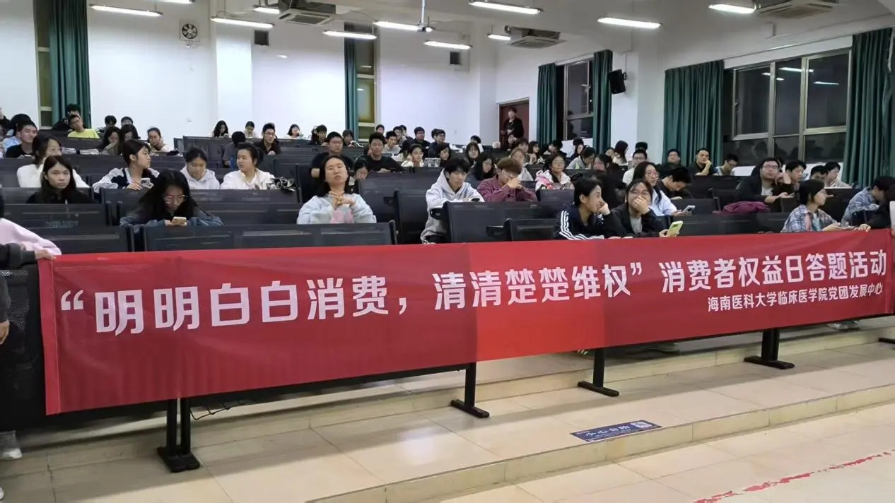 2025年3月16日晚上七点半由临床医学院党团发展中心开展3·15消费者权益日知识答题的活动现场,海医学子们热情高涨,积极踊跃地参与答题。他们在安静的教室,全神贯注地盯着屏幕,认真思考每一道题目。
