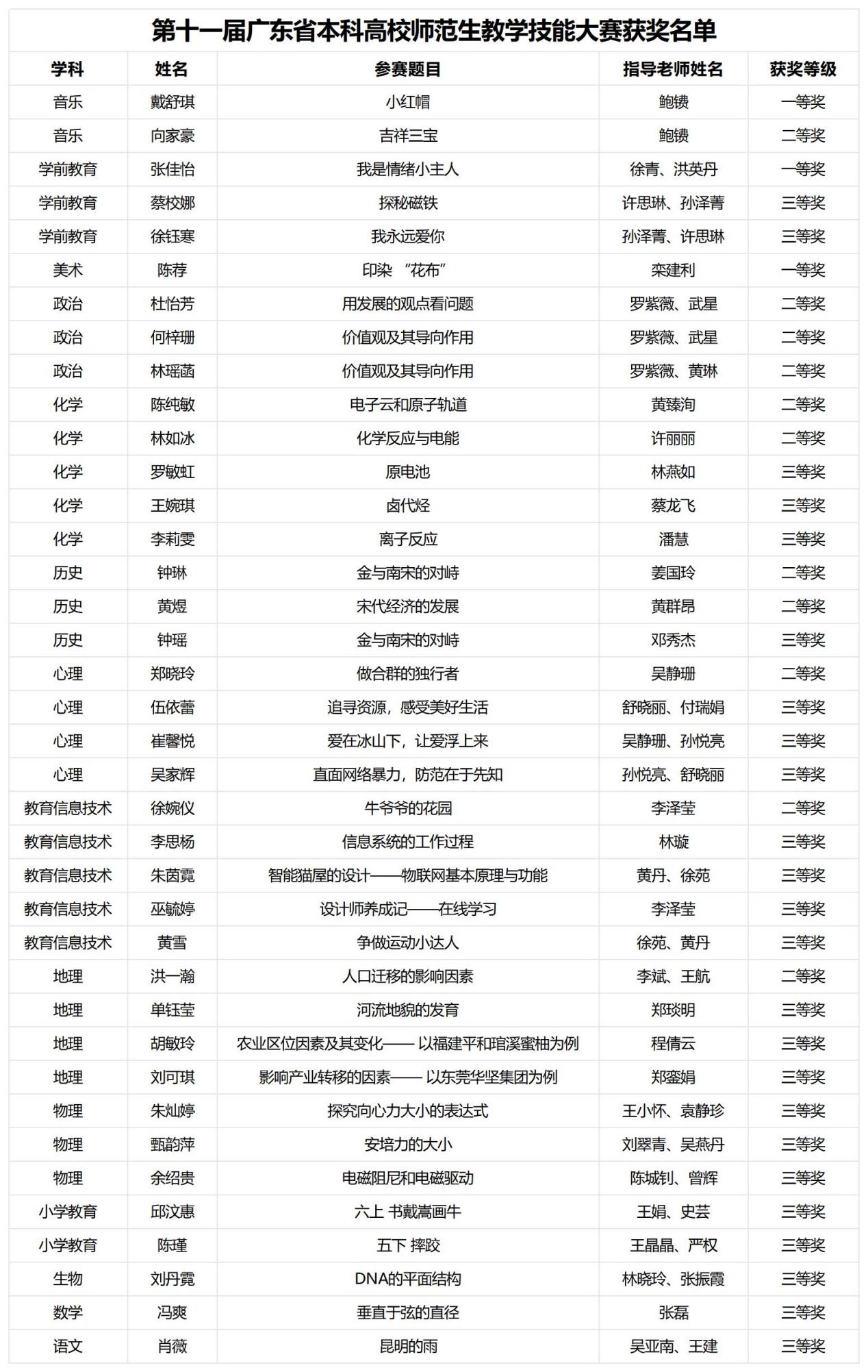 据悉,第十一届广东省本科高校师范生教学技能大赛由广东省教育厅主办,华南师范大学承办,大赛共评选出一等奖76名,二等奖112名,三等奖178名;另评选出“优秀指导教师”74名。该赛事是广东省级别最高、规模最大、影响最广的高水平师范生教学技能竞赛。大赛为广东省各高校师范生提供了交流的优质平台,对促进高等学校师范人才培养模式和实践教学的改革,提升全省本科高校师范专业学生的教育教学能力,起到了有效的推动作用。2023年广东省大学生生物化学实验技能大赛由广东省教育厅主办,华南农业大学承办,来自41所高校的827支队伍参赛。大赛共评出本科组一等奖8项、二等奖17项、三等奖26项。大赛旨在培养大学生创新意识和实践能力,促进高校生物化学学科教学改革,深化大学生创新创业教育,提高人才培养质量,助力粤港澳大湾区生命健康产业发展。我校历来重视锻炼学生教学理论和实践能力,比赛成果展示了我校学生扎实的教学基本功、良好的学科专业素养和积极向上的精神风貌,充分展现了我校专业人才培养成果。
