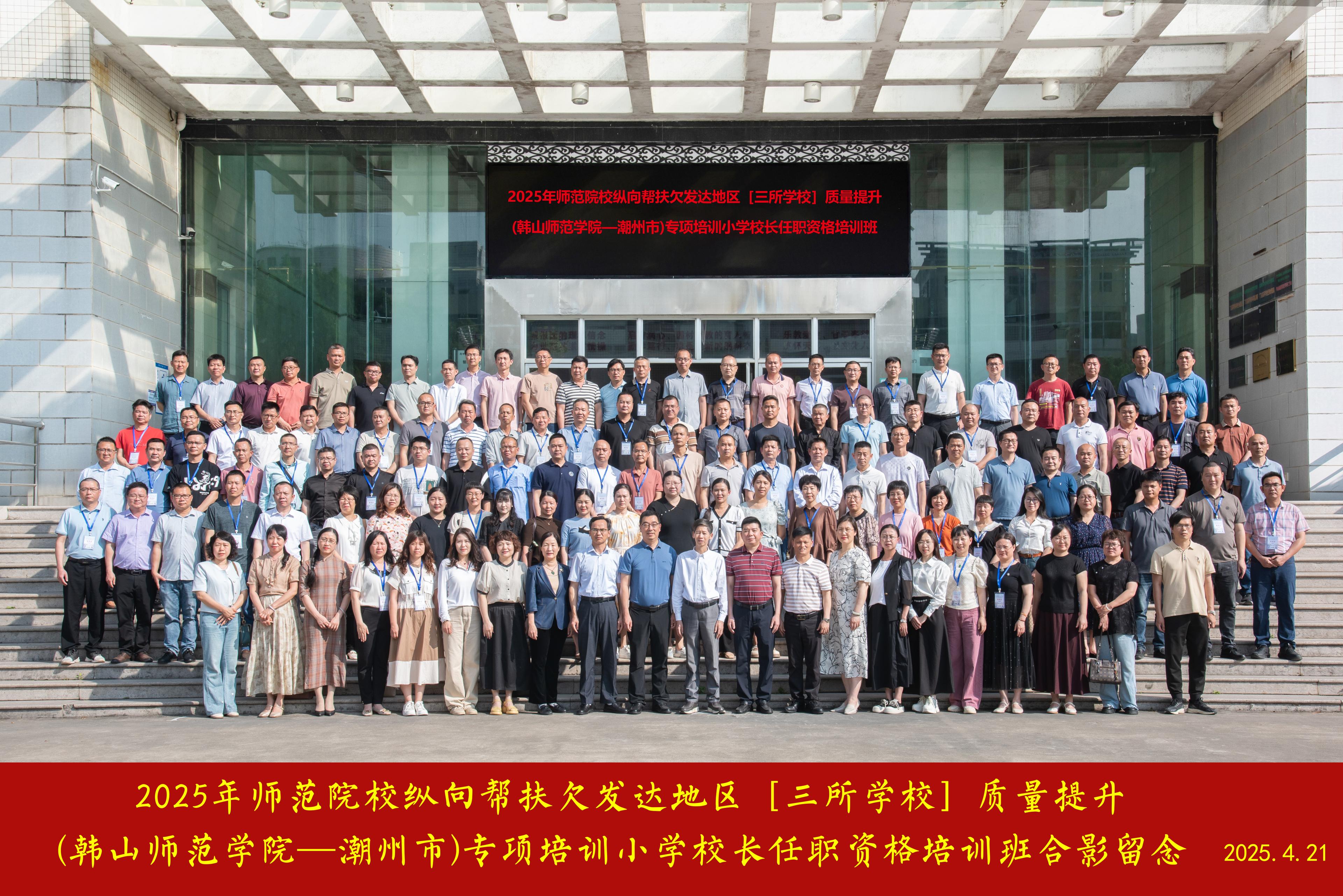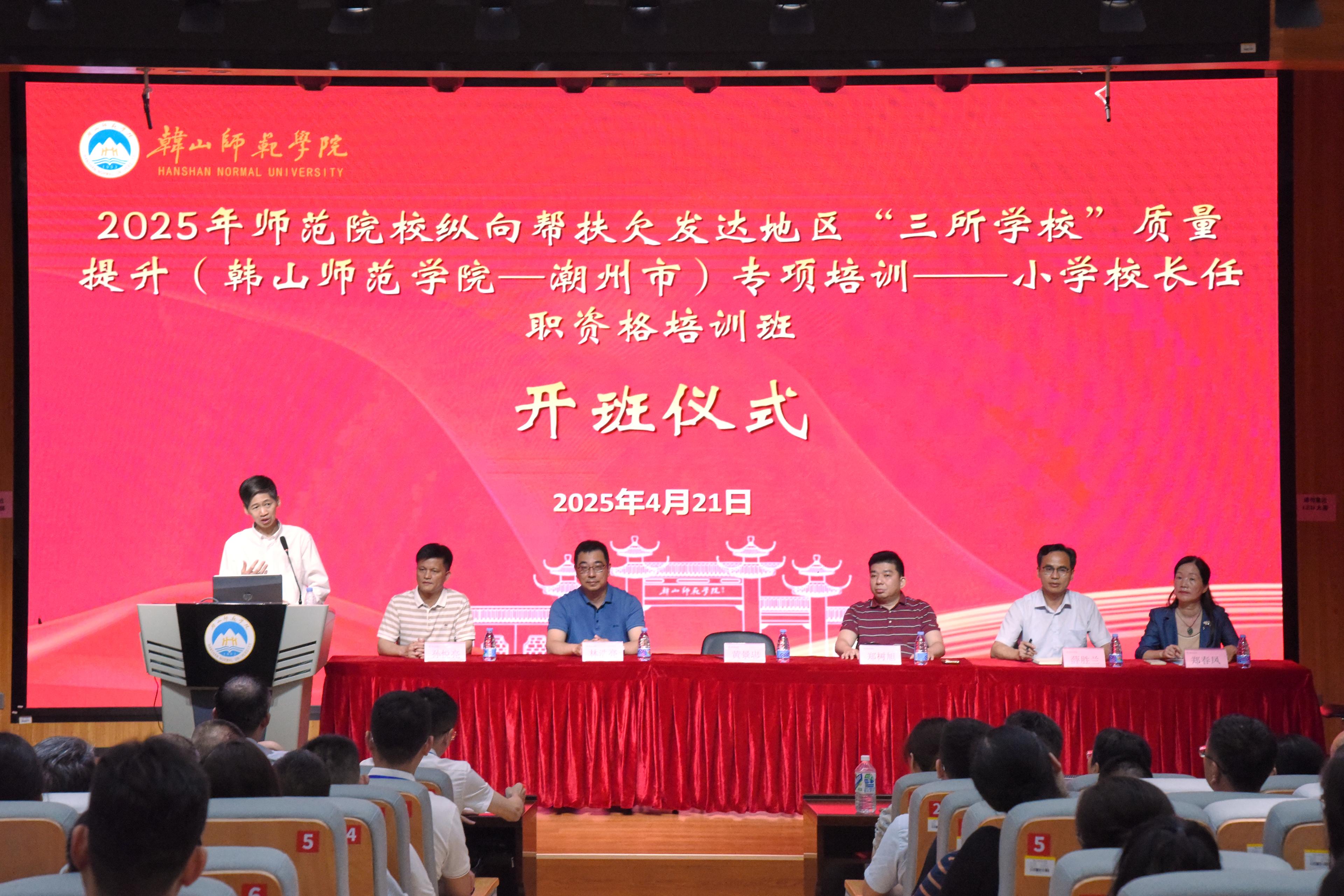 4月21日,2025年广东省师范院校纵向帮扶欠发达地区“三所学校”质量提升(韩山师范学院—潮州市)专项培训——小学校长任职资格培训班在韩山师范学院文科楼101室开班。我校副校长黄景忠、潮州市教育局副局长郑树旭出席开班仪式。