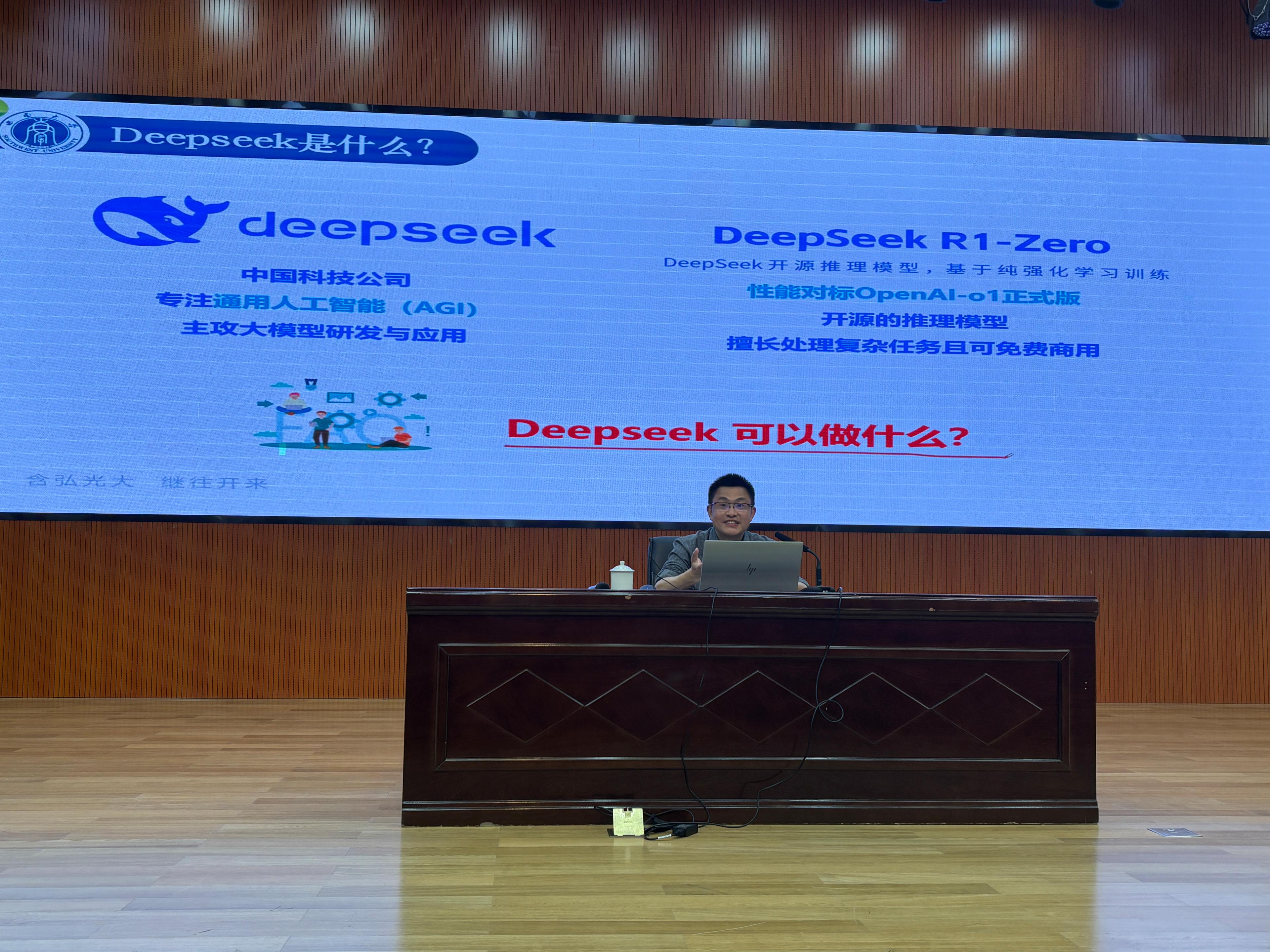 4月16日下午,西南大学大科学教育研究所所长、教育部中希文明互鉴中心·文明互鉴智能计算与决策实验室主任胡航教授应邀来校作题为《数智技术赋能深度学习(DeepSeek实操指南)》的专题讲座。讲座由我校教务部副部长冯健文主持。