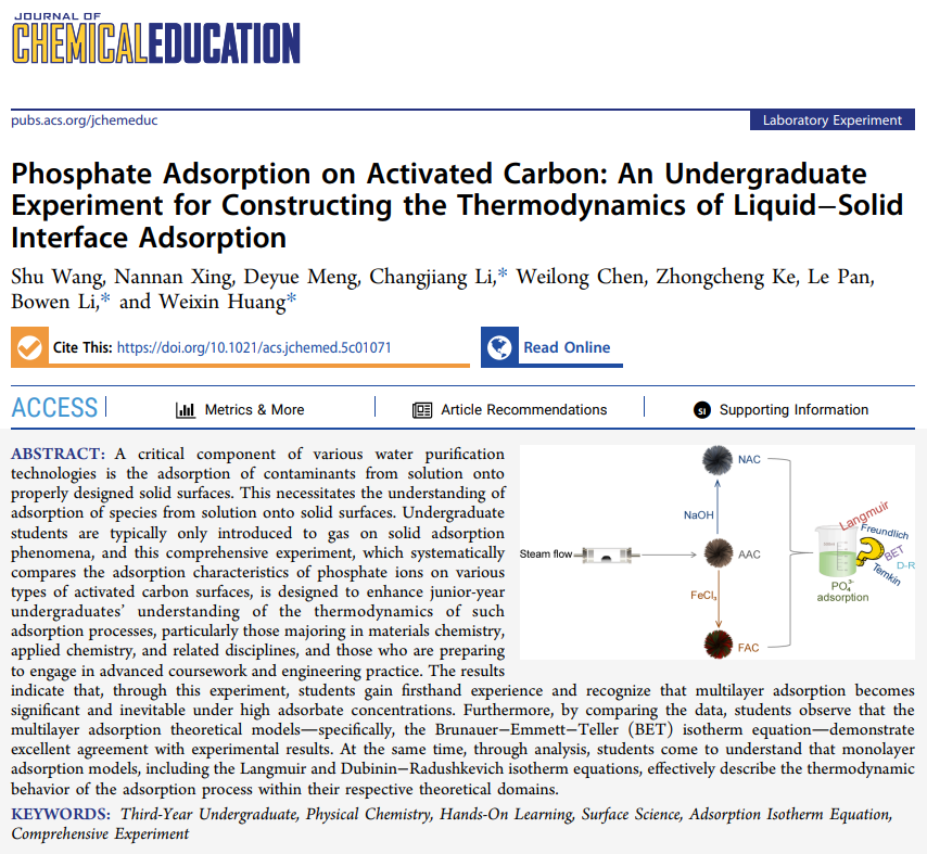 近日,我校化学化工学院王澍教授,李长江教授,优秀校友、安徽医科大学李博文教授和中国科学技术大学黄伟新教授合作完成的教研论文“Phosphate Adsorption on Activated Carbon: An Undergraduate Experiment for Constructing the Thermodynamics of Liquid−Solid Interface Adsorption(磷酸盐在活性炭上的吸附:面向本科生设计的液-固界面吸附热力学实验)”,在国际化学教育顶级期刊《Journal of Chemical Education》(JCE)正式发表(J. Chem. Educ. 2026, DOI: 10.1021/acs.jchemed.5c01071)。论文第一署名单位为黄山学院,王澍教授为第一作者,李长江教授、李博文教授、黄伟新教授为共同通讯作者。