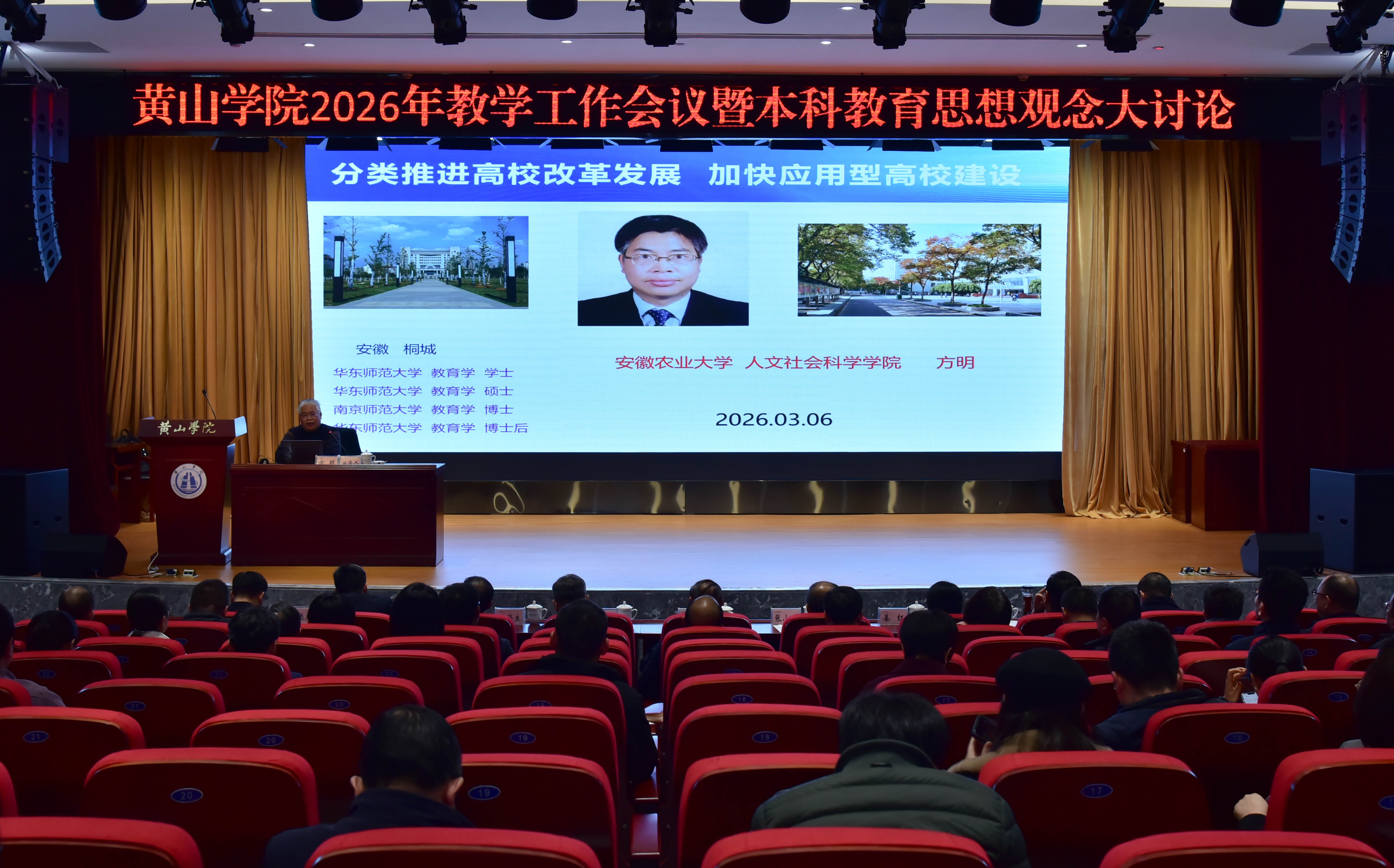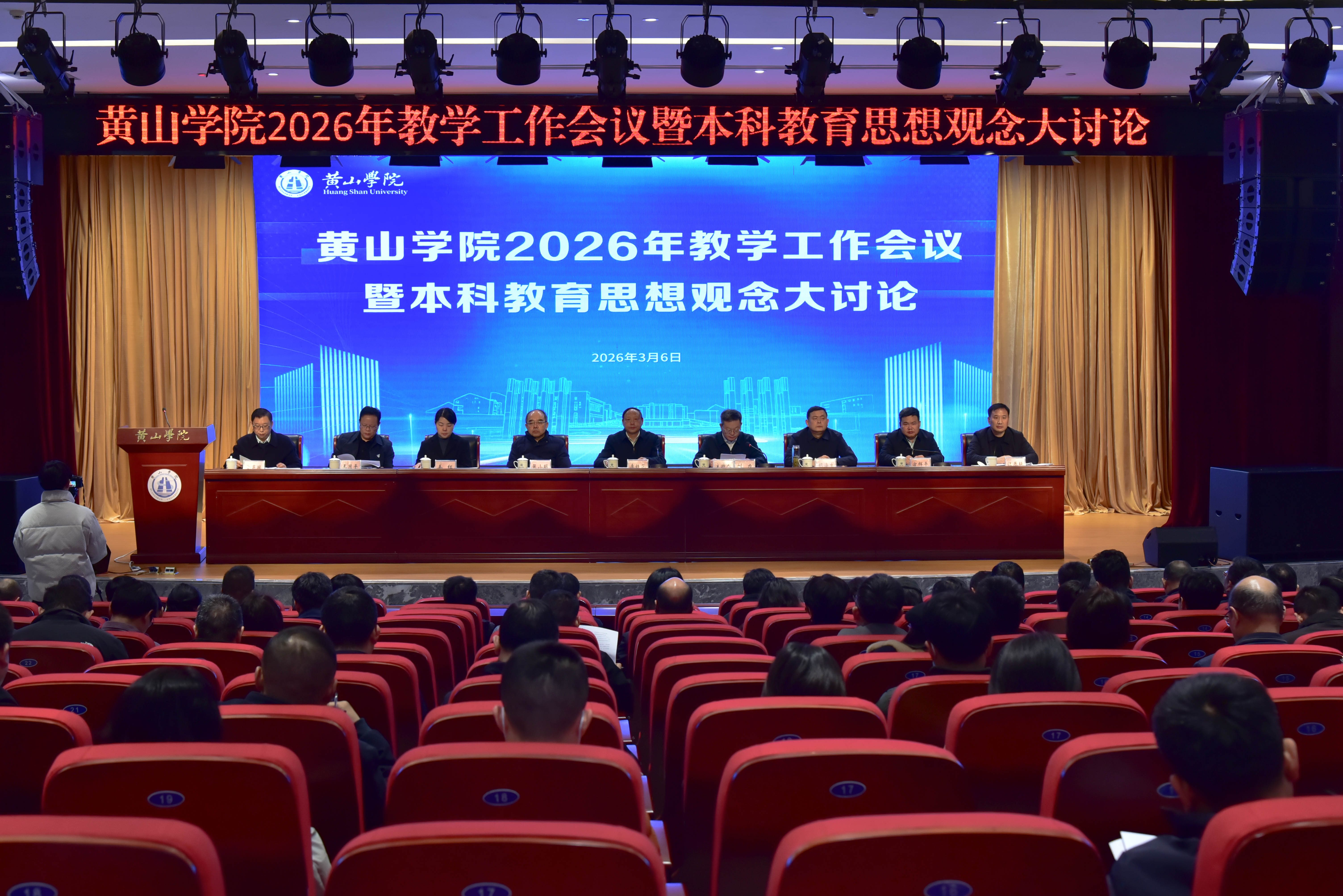 为进一步解放思想、凝聚共识,奋力谱写地方应用型高水平大学建设新篇章,3月6日上午,黄山学院2026年教学工作会议暨本科教育思想观念大讨论启动仪式在文博楼二楼报告厅举行。会议以“深化产教融合、强化数字赋能、创新构建特色应用型人才培养新体系”为主题。校党委书记李铁范出席并作动员讲话,校党委副书记刘力主持大会,校领导张小明、胡海生、姜红、方辉平出席会议。全体处级干部、高级职称教师、各教研室主任、实验实训中心主任、产教融合中心主任、校教学督导组成员,以及学生代表、合作企业代表等参加会议。