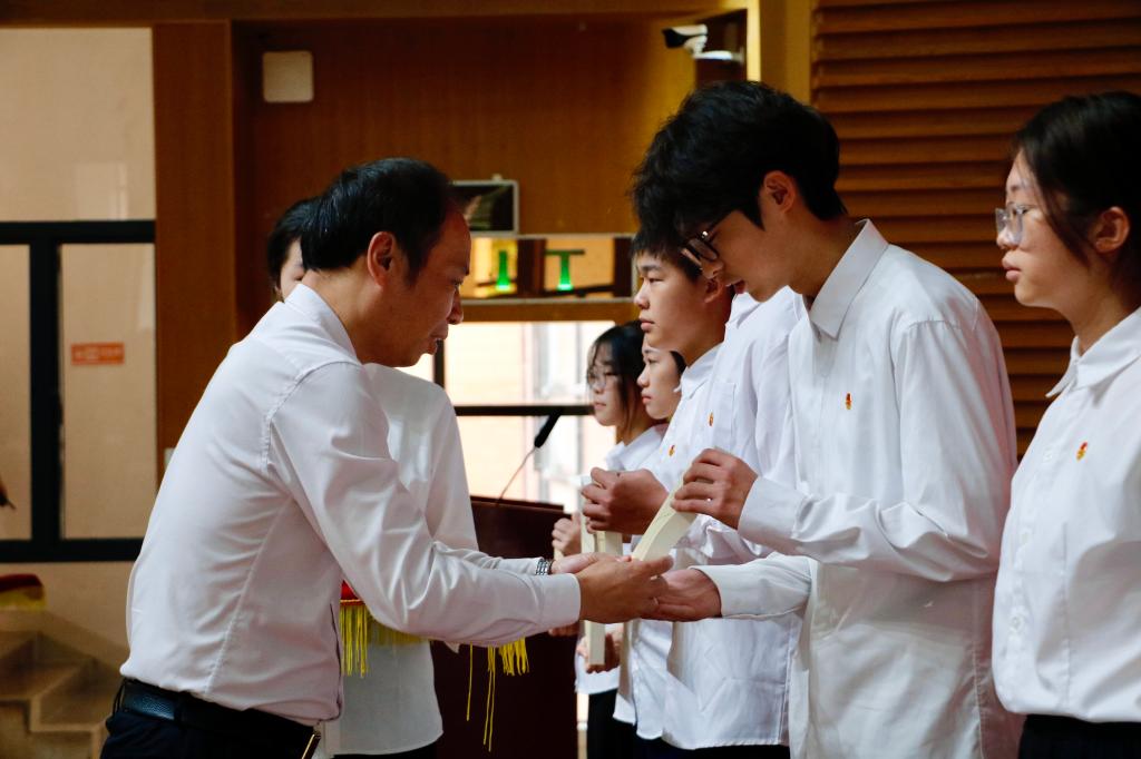 活动伊始,第三十二期青马班学员代表张博淇同学上台交流了心得体会,本期青马班学员代表黄丽冰同学做表带发言。交流发言后,姚家芳副校长为青年讲师团教师授聘书,组织人事处黄建华处长为新学员代表授书。