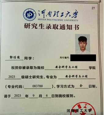 本科毕业后,郭佳俊以优异的成绩考入河南理工大学攻读硕士学位。在硕士阶段,他聚焦危化品燃爆灾害防控,深入钻研,取得了显著的研究成果。导师的悉心指导和学校的科研平台支持,使他迅速成长为该领域的青年才俊。