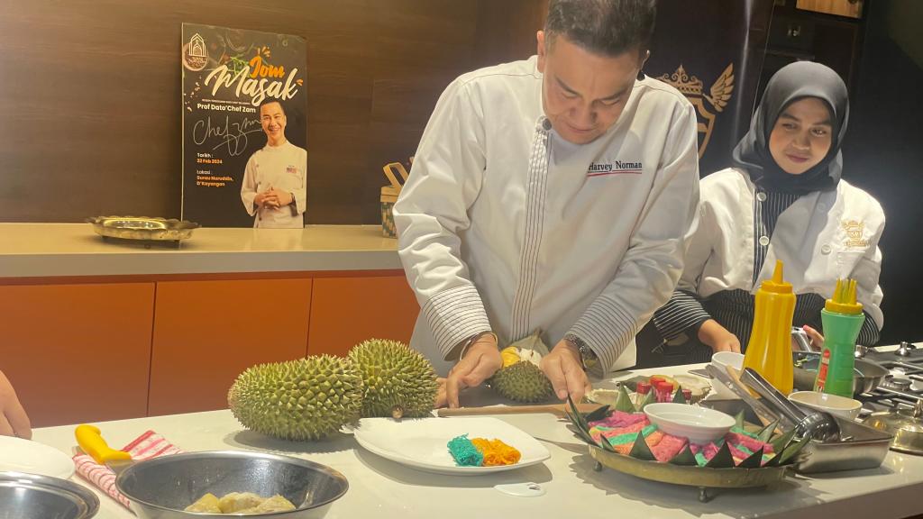 在菜肴技艺展示环节,富才学院师生带来了经典马来西亚餐Roti Jala(网状饼)和榴莲甜品的制作演示。富才学院校长扎姆扎尼亲自讲解,学生们熟练地操作,将面粉、椰浆和姜黄粉调制出薄如蝉翼的网状饼,搭配不同酱汁,展现了马来西亚美食的独特风味与文化魅力。
