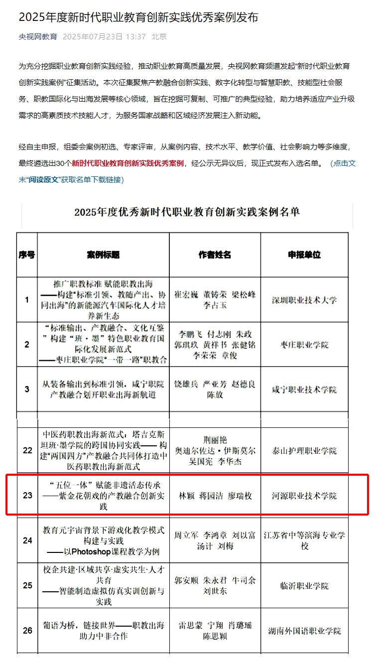 近日,由我校宣传部指导,科研处推送,林颖老师牵头的紫金花朝戏传习团队,继2024年入选新华网“非遗与职教融合发展优秀案例”后,再次凭借《“五位一体”赋能非遗活态传承:紫金花朝戏的产教融合创新实践》成功入选央视网主办的2025年度“新时代职业教育创新实践典型案例”,全国共30个项目入选,广东省仅3所院校榜上有名,成为非遗传承与职业教育协同育人的全国示范典型。