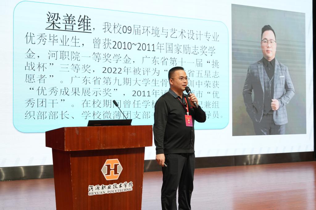 2012届环境与艺术设计专业校友、东莞市众鑫皮业有限公司总经理梁善维,介绍了公司“天网、地网、人网”的三维商业模式与“三利”经营哲学,分享了在前沿领域的投资布局。