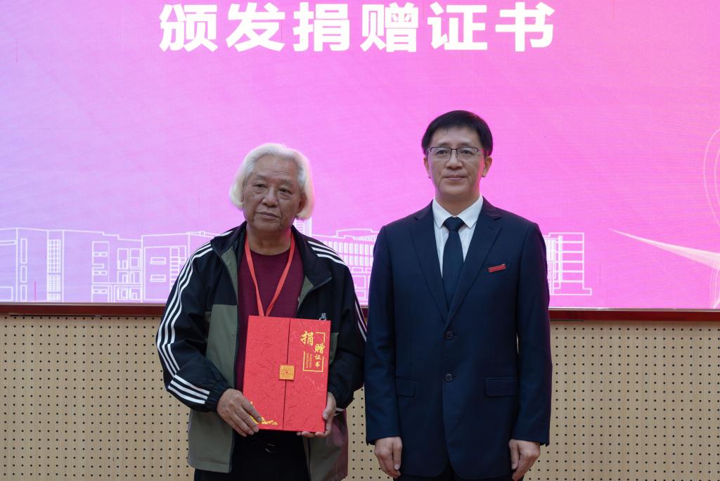 交流会上举行了庄重的捐赠仪式。学校党委委员、校友会会长赖新优宣读捐赠名单。