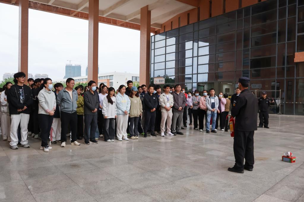下午4点,演练正式启动,文化展览区布下烟雾弹触发警报,各岗位工作人员迅速打开各区域防火门,引导师生捂住口鼻、低头弯腰,快速有序按预定路线撤离,距离警报发出3分钟后,所有人员安全撤离。演练后,所有人员集中在图书馆中庭,保卫处人员为大家讲解遇到消防险情后的应急逃生、防护、灭火等知识。实操环节,保卫处于图书馆中庭设置模拟火点,演示干粉灭火器、二氧化碳灭火器与水带连接灭火的操作要领,在场师生纷纷上前进行实操演练。