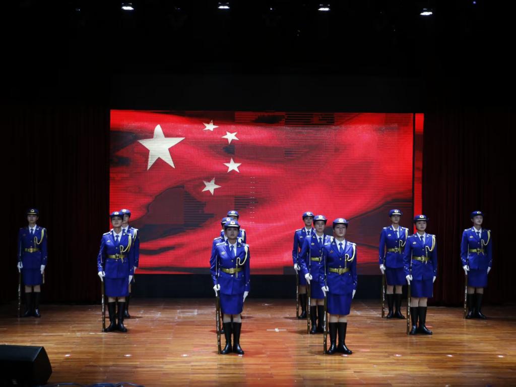 本次典礼还举行了国旗护卫队风采展示活动。舞狮表演刚劲有力;朗诵《相机上的红丝绳》通过情景朗诵演绎家国情怀;国旗护卫队进行军事技能展示,匕首操、军体拳、女子枪操轮番上演;大学生艺术团舞蹈队带来舞蹈《觉醒年代》;音教学子带来铿锵有力的合唱《强军战歌》。最后,全体参会人员合唱《歌唱祖国》,歌声整齐洪亮,将现场气氛推向了最高潮,本次典礼也在这激昂的歌声中圆满落幕。