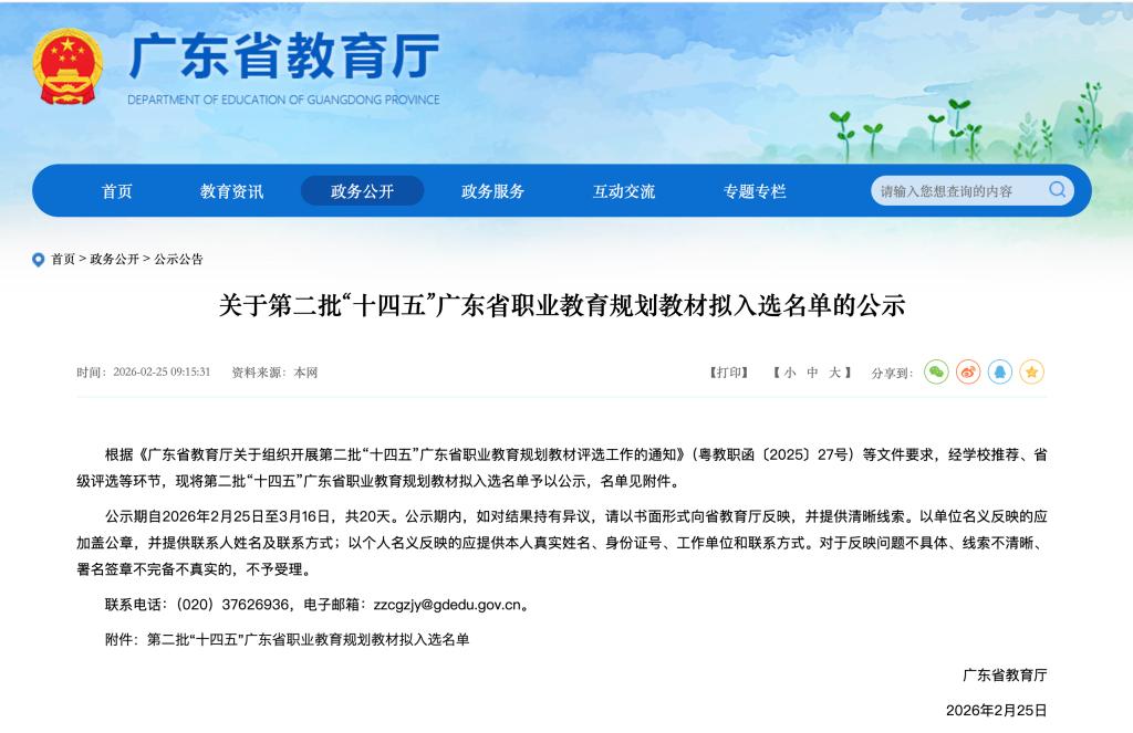 近日,广东省教育厅对第二批“十四五”广东省职业教育规划教材拟入选教材名单进行了公示,我校喜获佳绩,共有六部教材成功入选。这是我校在职业教育教材建设领域取得的又一重要成果,充分体现了我校在教学改革、课程建设和师资队伍建设方面的扎实成效。