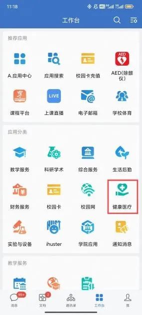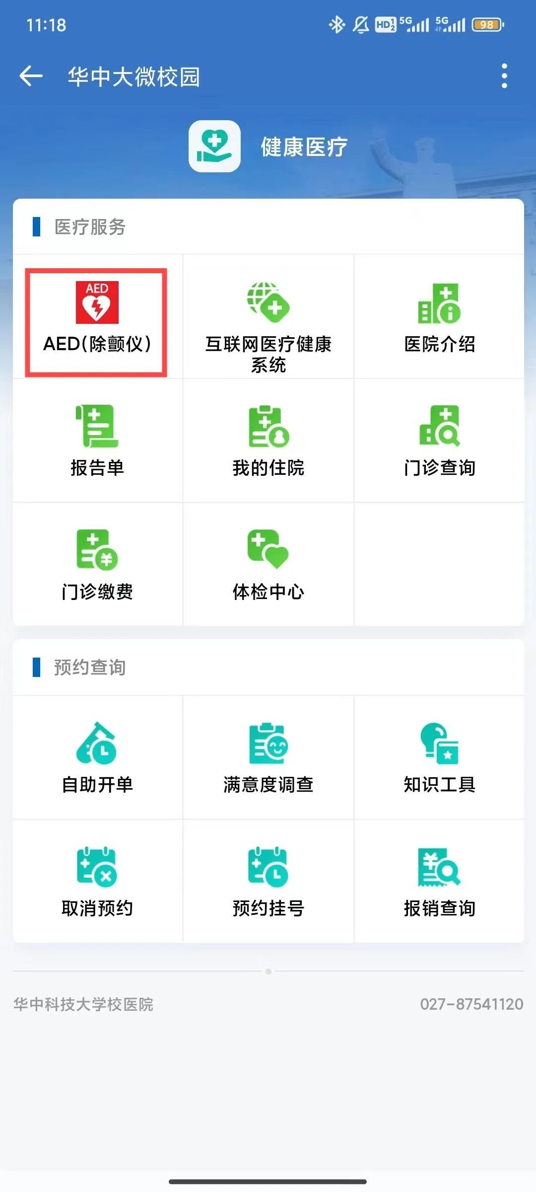 打开“企业微信”→点击“工作台”→点击“健康医疗”→选择“AED(除颤仪)” →查看具体位置