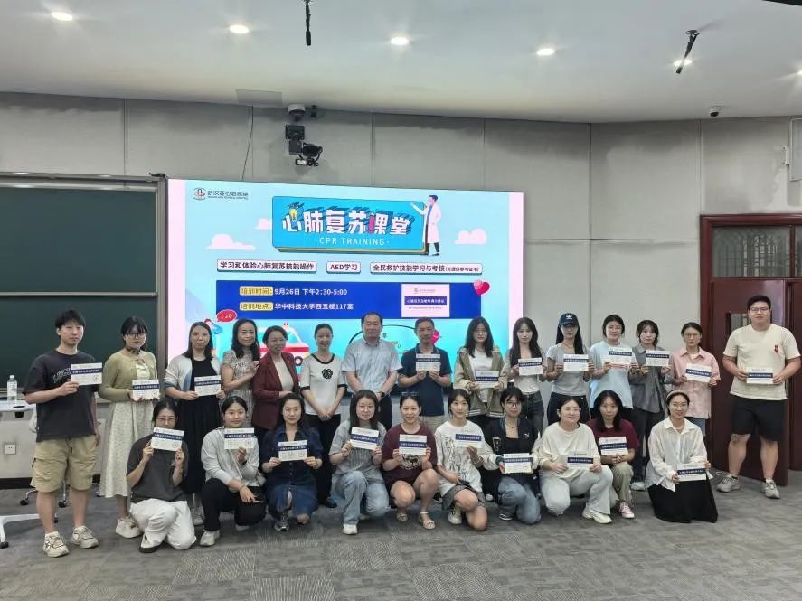 随后,学生们分组在模拟人上进行CPR练习。在实践环节中,学生们在张勇医生和护士的指导下,学习了如何正确识别心脏骤停、如何进行胸外按压、人工呼吸以及使用自动体外除颤器(AED)。在张勇医生及其团队的专业指导下,每个同学通过反复练习掌握了心脏复苏的要点,掌握了正确的姿势和位置。培训结束后,所有参与的同学都进行了现场考试,考核合格的同学获得了由武汉亚心总医院颁发的“心肺复苏急救培训合格证”。