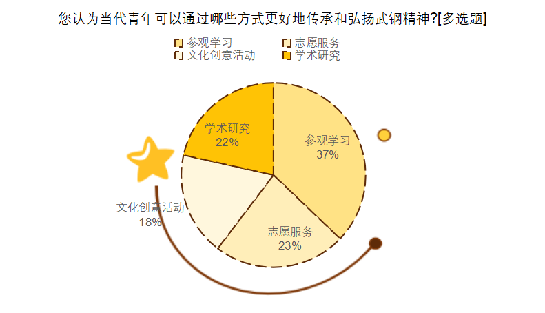 在调研过程中,实践团队亲身感受了包含“艰苦奋斗精神、三争精神、改革创新精神、红钢精神”的武钢精神和中国工业文化遗产的魅力,实践团队成员深刻体悟到本次特色实践不仅是一次工业之旅,更是一次深刻的历史和现代工业文明的对话。实践结束后,成员们更加坚信,中国的工业实力是坚实的,这种实力的背后,是无数工人的辛勤付出和智慧的结晶。调研之后,团队成员结合自身感悟就“武钢时代价值”这一主题,开展了问卷调查工作,共收集到118份有效样本,进一步了解了新时代青年对于武钢精神的认知与感悟,以期探索武钢文化发展的现代路径。