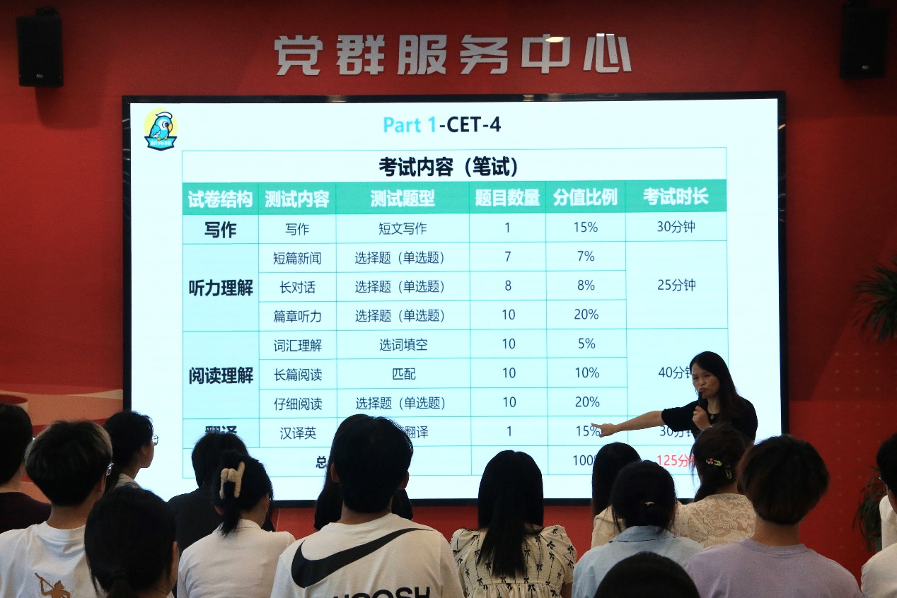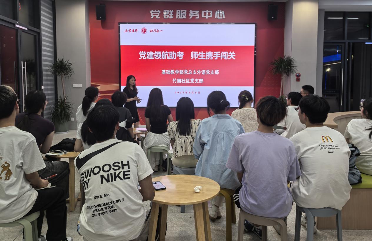6月5日,基础教学部外语党支部联合竹园社区功能型党支部,在“一站式”学生行知社区党群服务中心举办“党建领航助考,师生携手闯关”大学英语四级冲刺专题辅导讲座,通过“党建+学业帮扶”模式助力学生备战四级考试。外语党支部副书记刘彩琴紧扣四级考试大纲要求,从阅读、翻译、写作、听力四大核心模块入手,通过真题示例进行系统梳理与深度解析,针对重点难点问题讲授了考试的实用技巧和应对策略。她鼓励同学们保持积极心态,“以稳扎稳打、步步为营的备考节奏迎接考试挑战”。