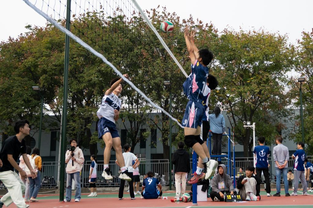 开幕式后,8场小组赛打响。在外国语学院代表队和一排即合一队(以下简称“一队”)的比赛中,外院率先通过发球得到首分。面对对方势大力沉的开球,一队沉着应对,一系列灵活传递和迅猛扣杀后,他们反超比分并将分差拉大到10:2。此时,外院2号李家翔挺身而出,通过背打和拨球,帮助外院紧咬比分。一队不甘示弱,13:7,先进入技术暂停。短暂休息后,一队迅速进入状态,拦网、传球、救球、扣杀,行云流水,一气呵成,打出了12:4的小高潮。最终,一队以25:11拿下第一局。