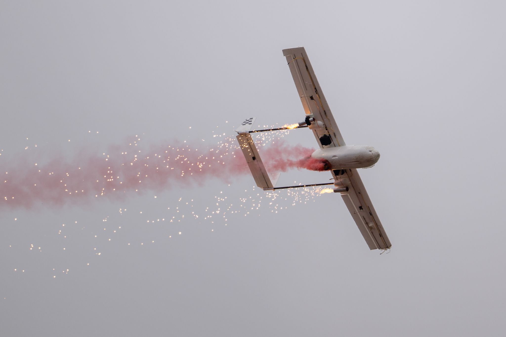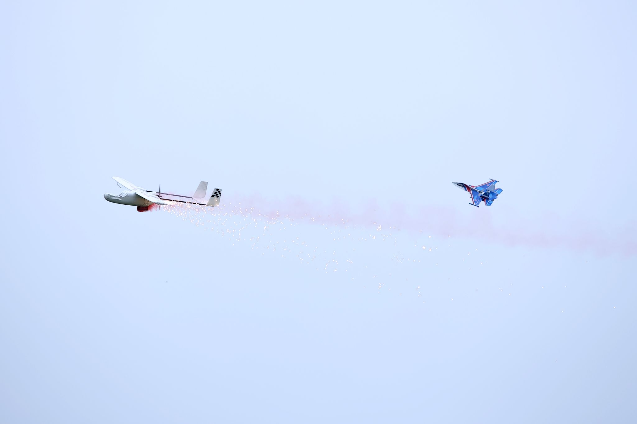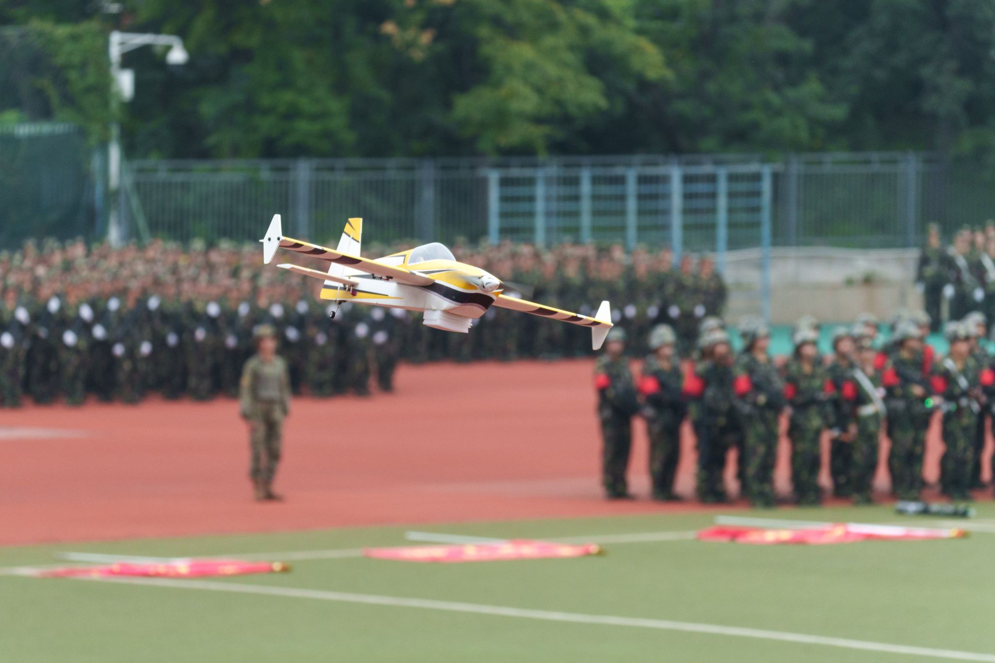 首先进行的由承训单位带来的无人机动态飞行展示。尖锐的呼啸声直冲云霄,特技飞机“赤色幻象”带着彩色飘带翻转腾挪,翩若惊鸿,宛若游龙。翻转、侧飞、整机滚转九十度,3D无人机特技华丽而不失优雅,动作精准、干净,无人机全力克服地心引力悬停,仿佛倒挂在天空上。白色的机身融入天空,装配了飞控系统和GPS定位系统的飞机在固定翼察打飞行表演中亮相。“猎鹰苏-27”飞行编队威武列阵,俯冲旋转,动作整齐划一,在运动场上空呼啸而过。