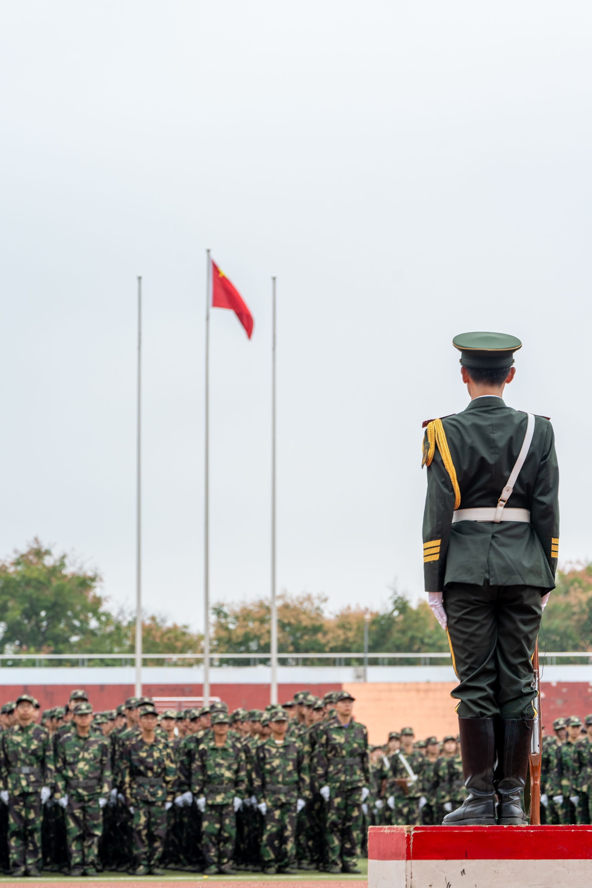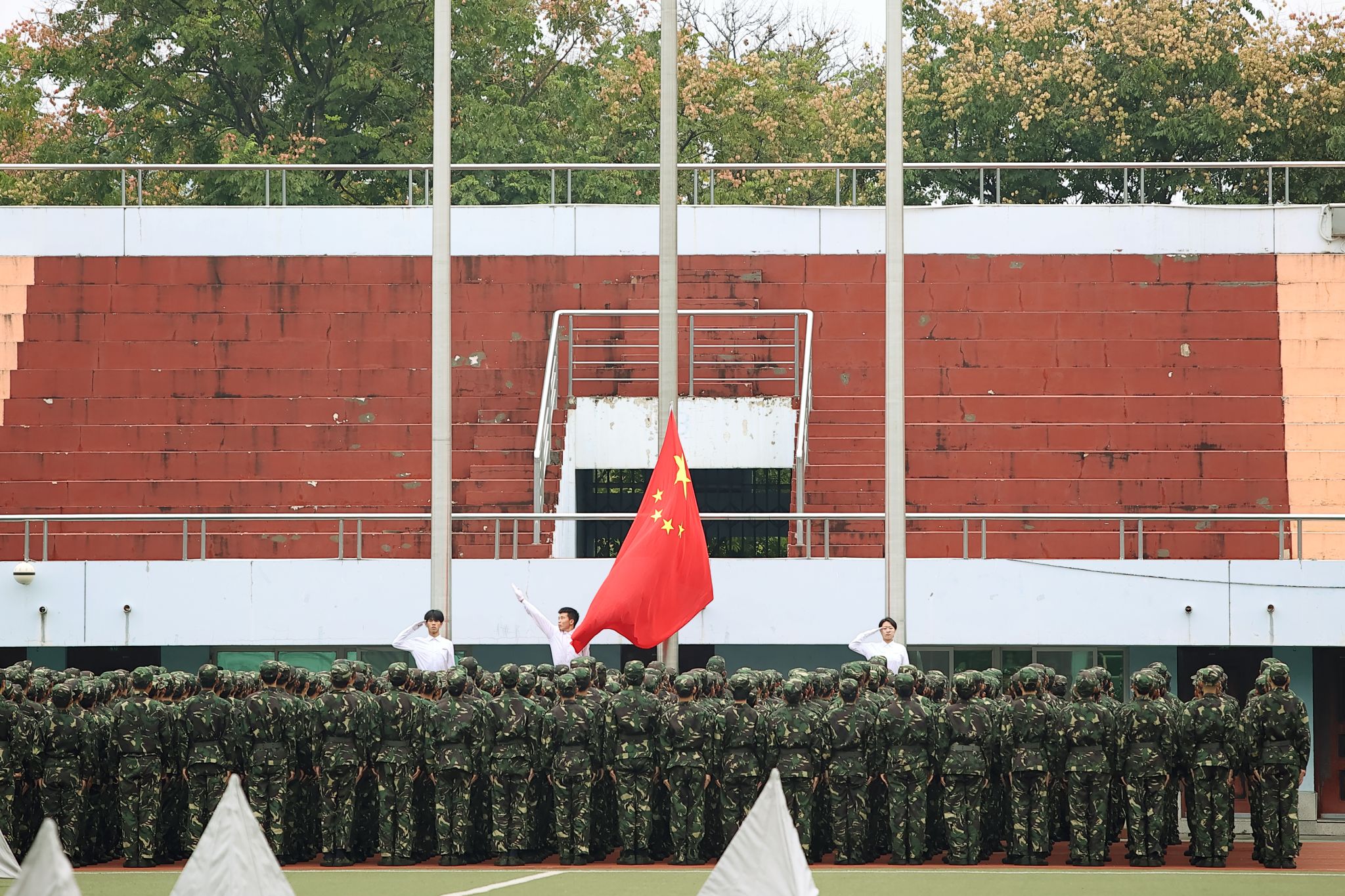 在雄壮的国歌声中,五星红旗冉冉升起,全体人员肃立齐声高唱国歌,军训结业式正式开始。