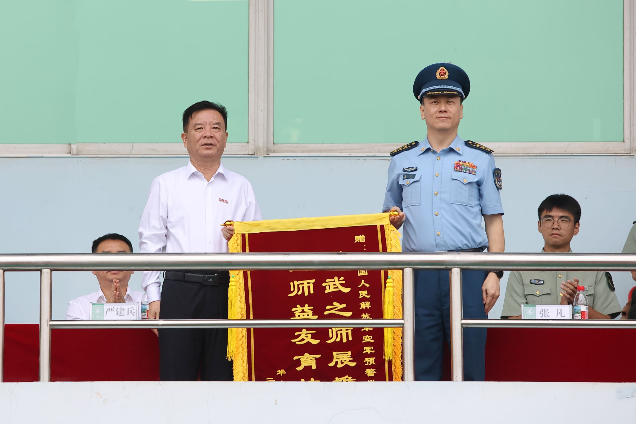 ▲校党委书记姚江林向承训单位中国人民解放军空军预警学院赠送锦旗(通讯员 侯国涛 摄)