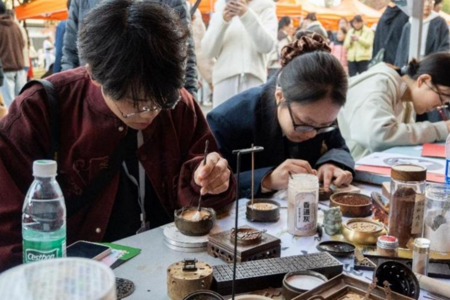 同学们在民俗文化与民间艺术协会体验压香灰(学通社记者 李卓玲 摄)