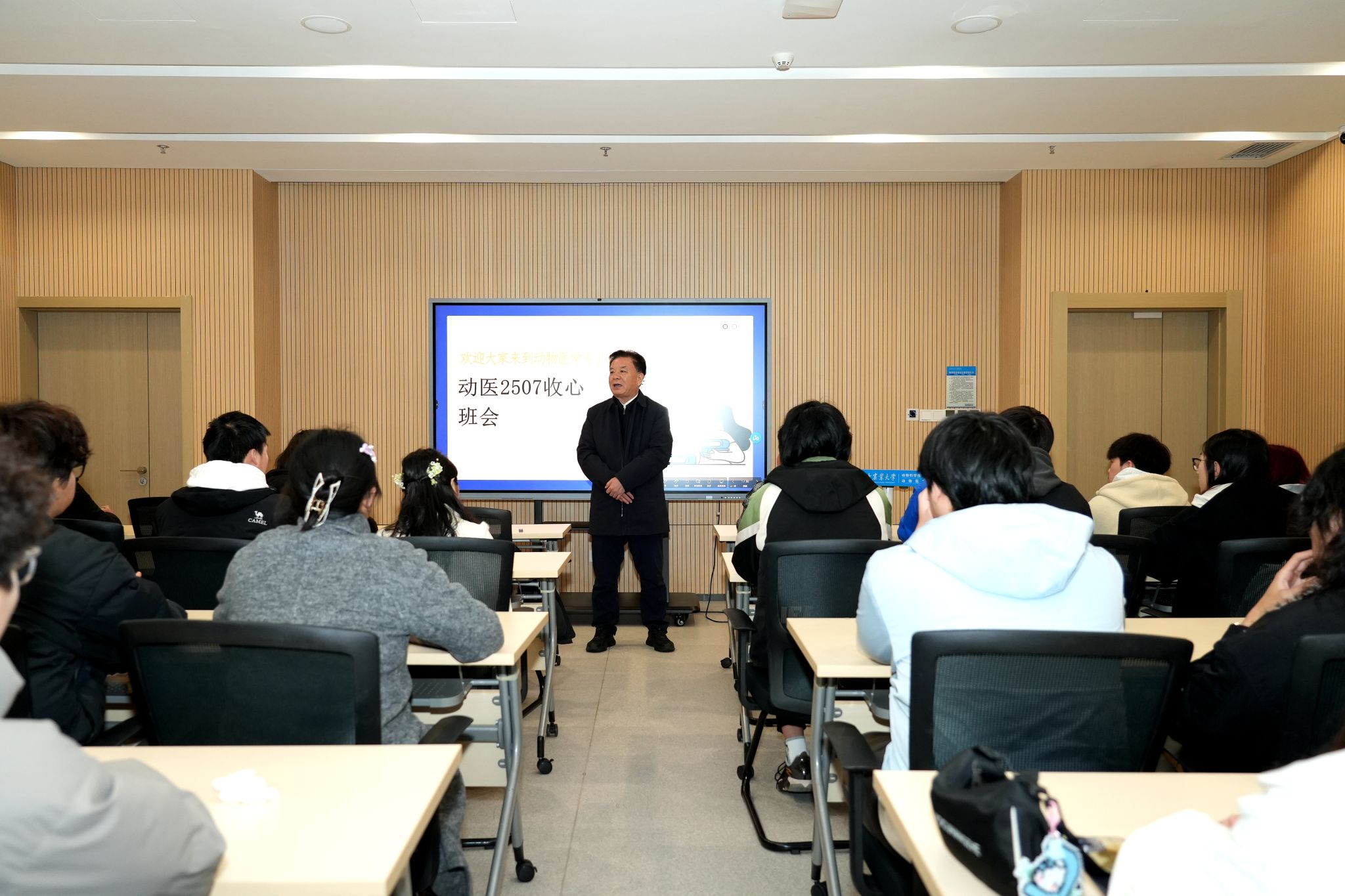 在第四综合楼B201会议室,姚江林出席了动医2507班新学期主题班会。他勉励同学们不忘初心、策马扬鞭,强化人生规划,明晰奋斗目标,持续锤炼过硬本领,努力把肩膀练得更 “宽”、更 “硬”,矢志不渝朝着梦想笃定前行。他希望同学们团结奋进、携手共进,不断增强班级凝聚力、向心力与战斗力,营造万马奔腾、比学赶超的良好氛围,以马不停蹄的干劲、久久为功的韧劲,全面提升综合素质,努力成长为可堪大用、能担重任的栋梁之才,在强国建设、民族复兴的伟大征程中贡献青春力量。