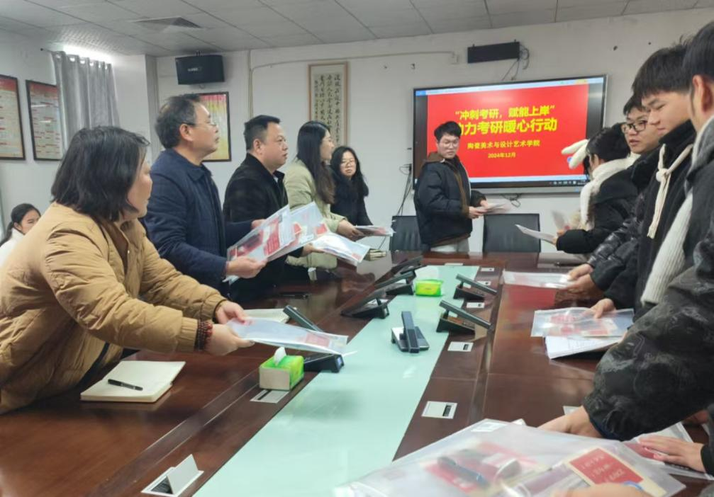 岁月不负少年意,旗开得胜终有时。今年的全国硕士研究生招生考试日益临近,为切实强化校园学风建设,进一步坚定2025届考研学子考研信心,缓解考前压力,提振考研复习冲刺阶段的士气和决心,近日,陶瓷美术与设计艺术学院在党员活动室开展“冲刺考研,赋能上岸”助力考研暖心行动。陶瓷美术与设计艺术学院党委书记陈后辉、党委副书记胡文毅、副院长程幸、副院长朱希睿、党委委员姜强出席活动,毕业班辅导员及2025届考研学生参与此次活动,学工科副科长张朋主持活动。