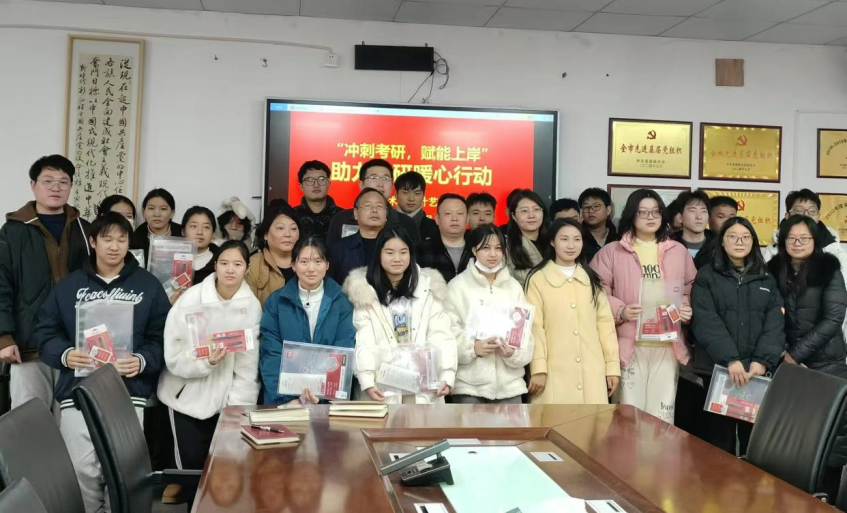 现场还为考研学子播放了祝福视频,全学院师生一起为考研学子加油鼓劲,一句句暖心的话语蕴含着对考生们的深情祝愿与殷切期许。考生们认真观看,感动不已。学院还为每位考生精心准备了一份“暖心助力”文具礼包,领导与老师们亲自为考研学子分发,一份小小的“暖心加油包”满载着深情厚谊,寓意着“‘包’你上岸”的美好期待与祝福。活动现场可谓温馨热烈,情真意切,令人动容!同学们深受鼓舞,纷纷表示将以更加饱满的热情和昂扬的斗志投入到最后阶段的考研备考中。