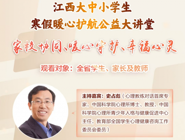 为贯彻落实江西省教育厅《关于做好假期学生心理健康教育工作的通知》文件要求,教育学院精心组织全体师生、家长于1月22日晚20:00—21:30在线收看由中科院心理所史占彪教授主讲、主题为“家校协同、暖心守护、幸福心灵”的公益大讲堂。