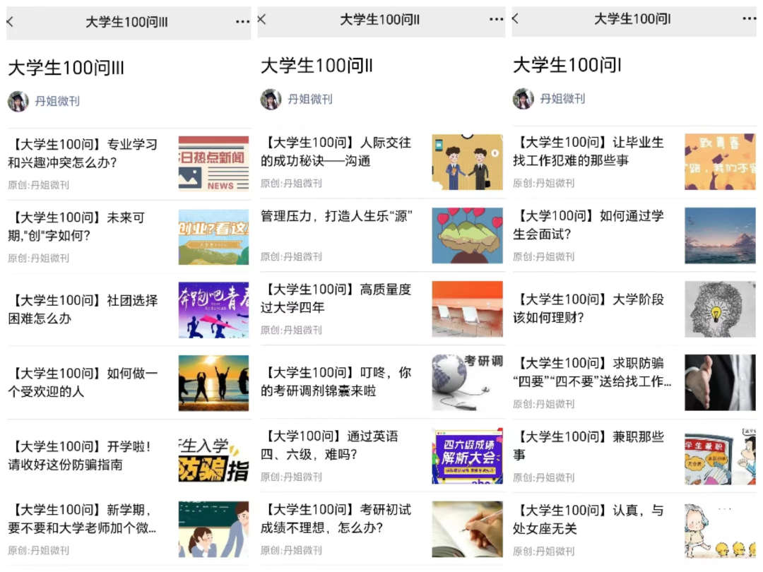 2020年至今,井冈山大学辅导员通过深入班级寝室现场调研、互联网征集等方式收集大学生成长发展中的问题和困惑,有组织地针对各类困惑进行在线答疑。辅导员们敞开心扉、昼夜笔耕,倾其所悟,形成“大学生100问”系列网文在辅导员微信公众号“丹姐微刊”和“云端新青年”上连载发表,系列网文从即将迈入大学的准大学生开始,围绕如何新生如何适应大学,大学应该如何度过,大学生活如何规划等关键问题,涵盖新生必读、大学学习、素质提升、情感态度、生活指导、就业指导等六个方面的内容,成为大学生顺利完成大学的“移动百科全书”。例如,面对期末考试结束后,同学们担心挂科,迷茫焦虑的状态,一篇推文《叮咚,你的期末成绩报告单》来了,引导大学生正确认识自己的期末成绩,对寒暑假进行合理规划。《入党申请书指南已到,请查收》解决了入党申请人难以动笔,申请书内容假大空等问题。