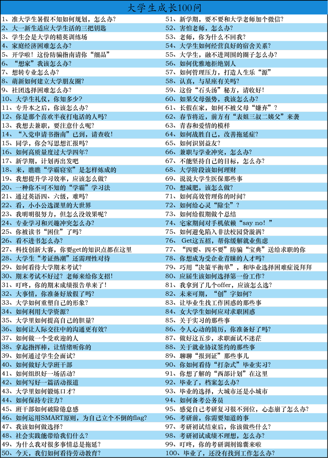“如何尽快地适应大学生活”、“怎样做好生涯规划”、“怎样在人心浮躁的今天练就不娇不馁的平静”、“怎样在校园活动中赢得他人的赞誉”、“怎么与父母保持流畅的沟通”……大学是青春成长的关键时期,不同时期,不同阶段的大学生在成长过程中都会遇到各种问题和困惑。井冈山大学的辅导员结合实际,深入一线开展调研,紧密对接学生的实际需求、接受习惯、心理特点,形成了《大学生成长100问》,通过网络发布,引起高校大学生的广泛好评。