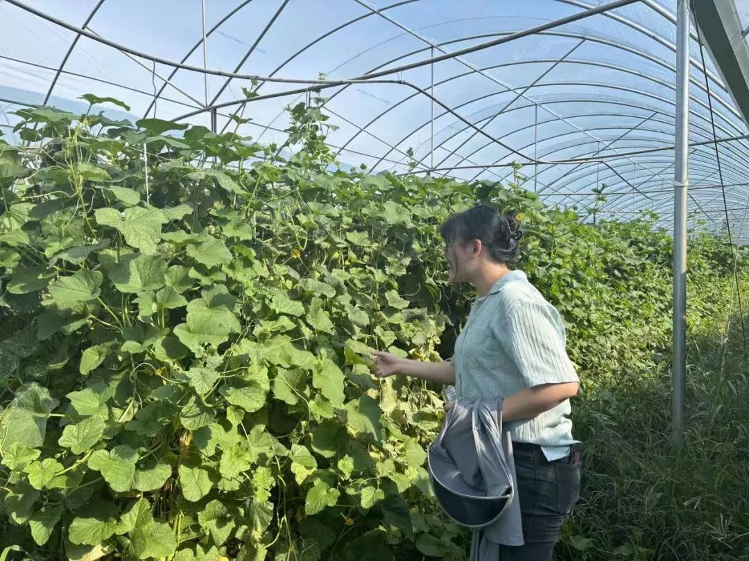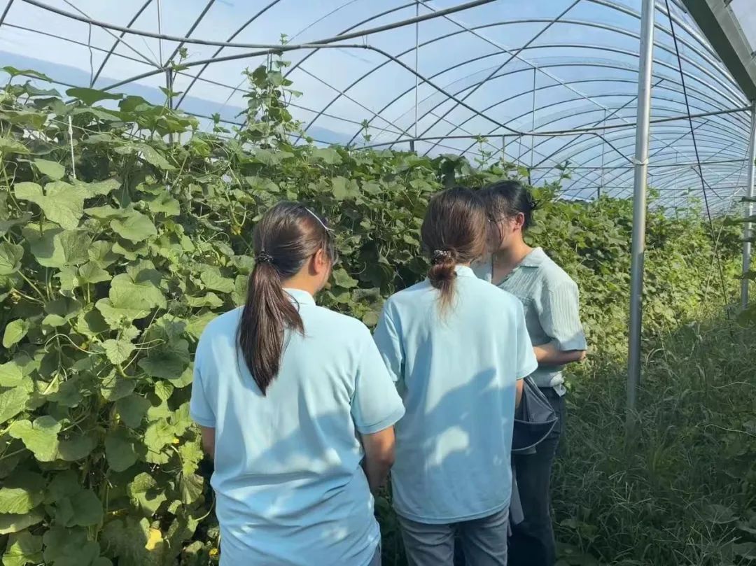 访谈结束后,“青衿医语”暑期社会实践团的成员们跟随天玉镇党政办主任周昱晨前往天玉镇乡村振兴教学示范基地——吉安丰沃生态农业科技有限公司(天玉基地)进行参观。该基地用于连体大棚、排灌及土地整理、水肥一体化等基础设施建设,现建成有大棚约120亩,主栽苦瓜、哈密瓜、西红柿等有机绿色精品果蔬,二期还将扩种大棚300亩,同步建设冷库和生产车间等配套设施,打造集生产、加工、冷藏、销售于一体的产业链,同时还能带动周边就业,增加村民人均年收入。刚踏入基地,连片的智能温室大棚、规整的种植区映入眼帘。
