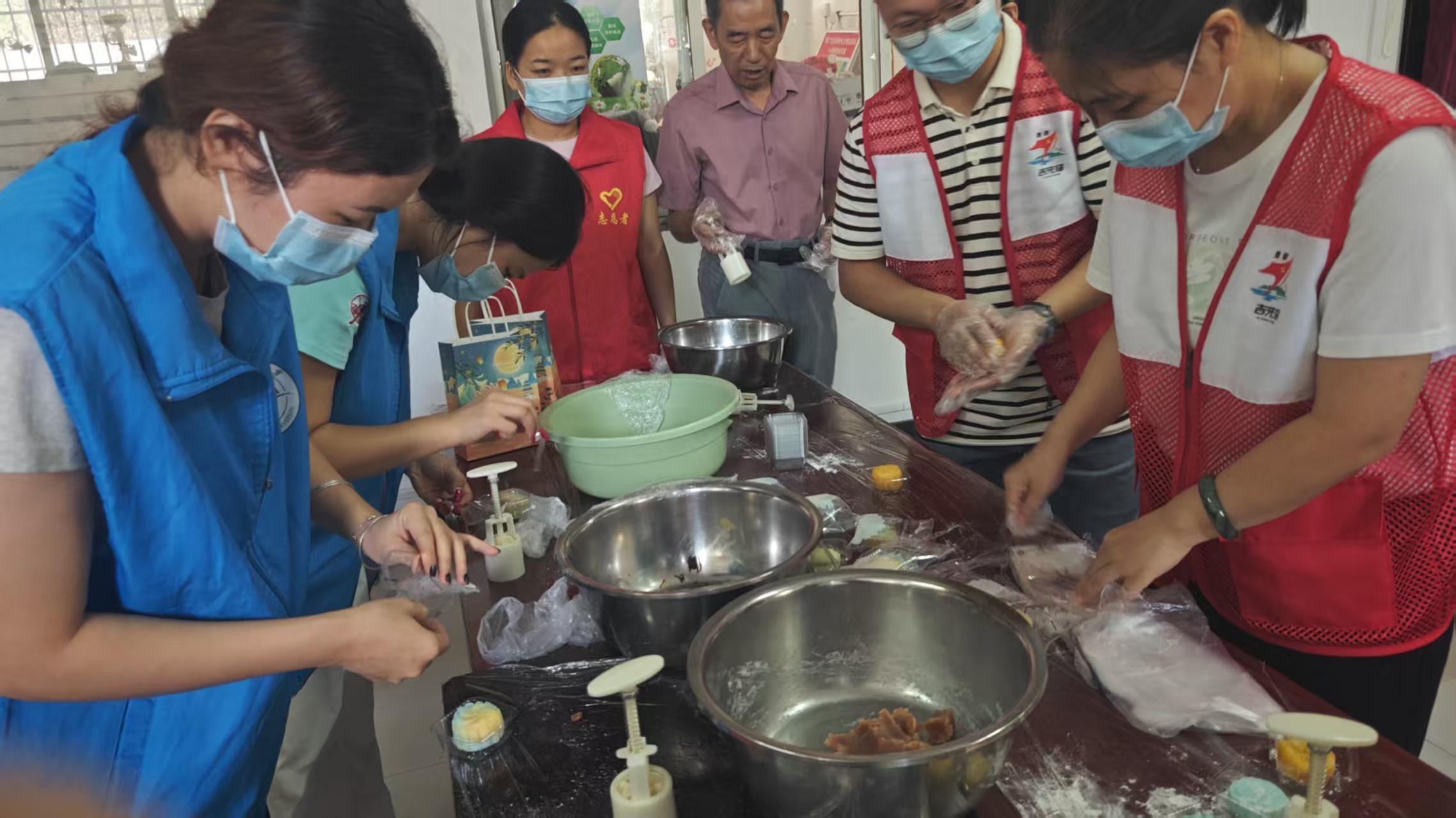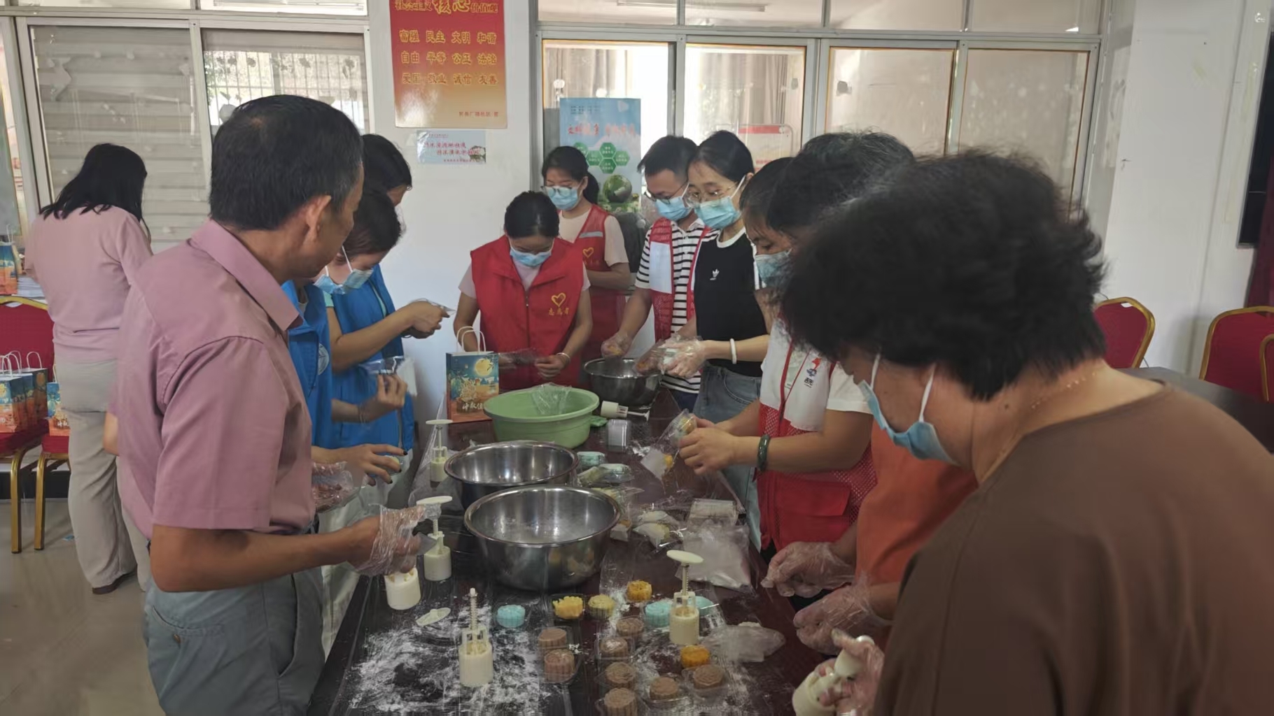 活动前期,志愿者们精心统筹布置,温馨的节日装饰点缀现场,操作台上整齐摆放着冰皮预拌粉、低糖豆沙、莲蓉等月饼制作原料,以及印有中秋元素的各式模具,为志愿实践活动做好充分准备。
