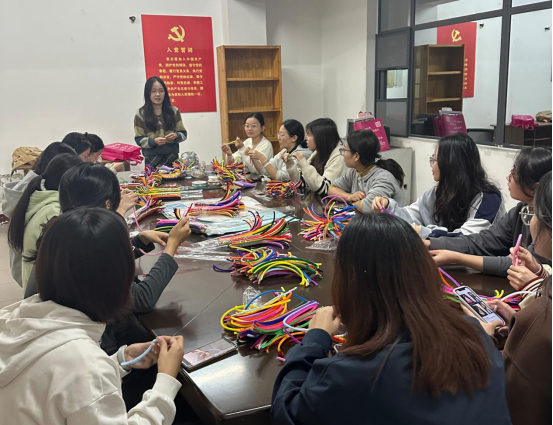 在随后的动手环节,法学院“一站式”学生社区瞬间变成了一个充满创造力的“社区疗愈工坊”。同学们围坐在一起,指尖飞舞,将五彩的扭扭棒变成一朵朵独具匠心的花朵。在这个熟悉的环境中,同学们放下了平日课堂上的拘谨,在轻松愉快的氛围中相互交流、彼此帮助,不仅释放了学业压力,更在协作中深化了同窗情谊,增强了社区归属感。