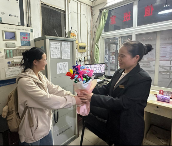 在“一站式学生社区”这个融学习、生活、交往于一体的空间里,同学们自发地将所有亲手制作的手工花集结成一束灿烂夺目、满载心意的花束。“阿姨,您辛苦了!”这束独一无二的“一站式”学生社区感恩之花,承载着同学们对宿管阿姨平日辛勤付出与默默关怀的深深谢意。这一举动,超越了单纯的手工制作,是一场深刻的感恩教育实践。它让同学们学会发现并感恩身边那些为“一站式”学生社区和谐稳定默默奉献的“守护者”,用行动传递了邻里关爱,营造了睦邻友好、感恩互助的“一站式”学生社区文化氛围。