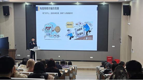 活动现场,董警官以权威数据敲响防诈警钟:当前电信网络诈骗呈现技术化、精准化趋势,学生群体受骗案件同比上升27%,AI换脸诈骗视频生成仅需3秒,仿冒校园缴费平台的钓鱼链接识别难度持续升级。董警官结合亲自侦办的校园诈骗案例,深入剖析诈骗行为的多重危害,例如财产损失、心理创伤、社会信任危机等。