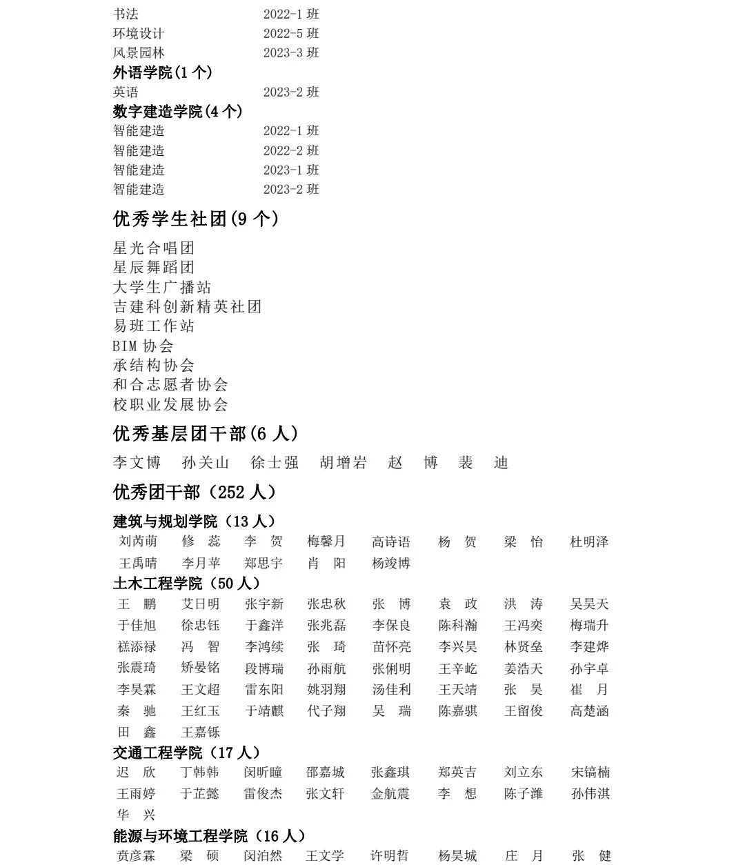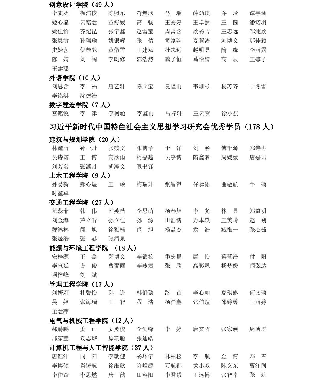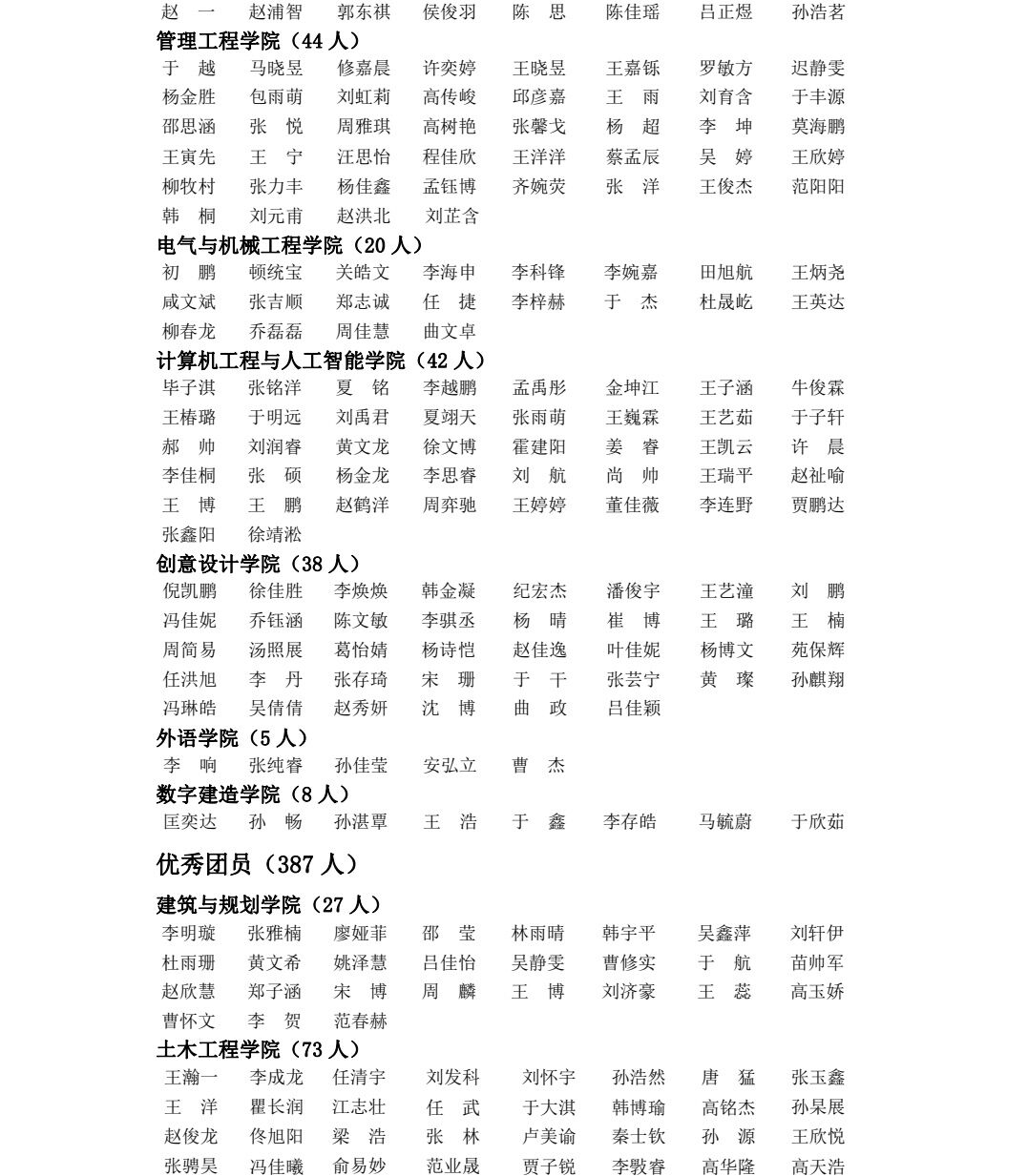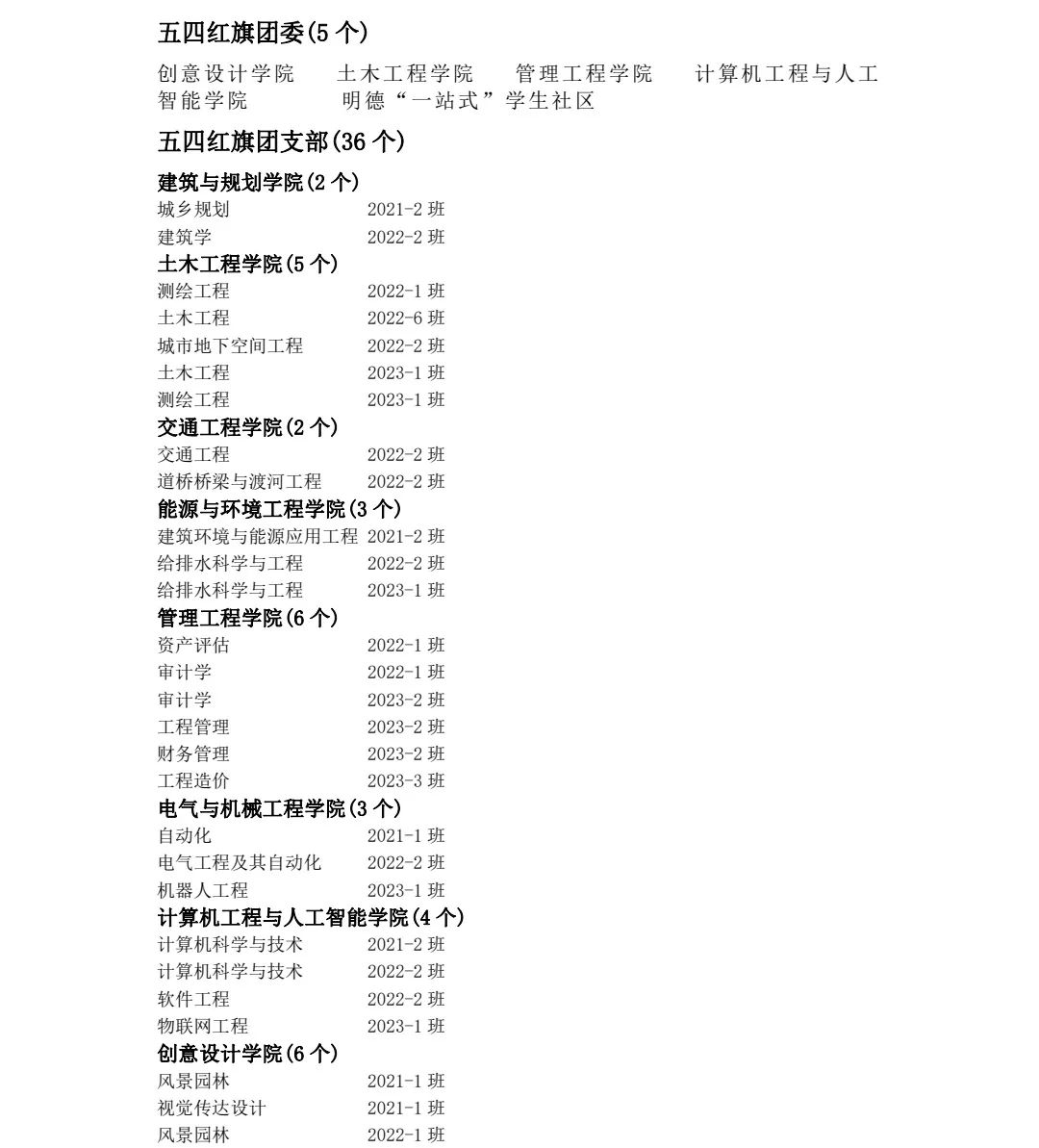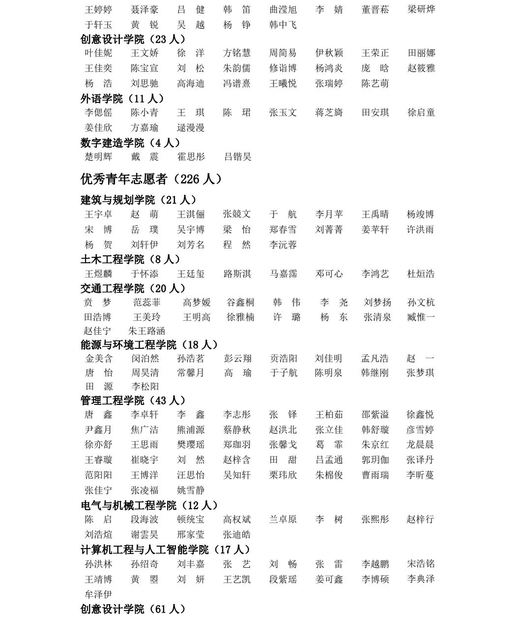 为表彰先进,树立典型,进一步推动我校共青团工作,校团委决定对在2023/2024学年涌现出的先进集体和优秀个人以及志愿服务工作中涌现出的志愿者予以表彰。授予创意设计学院、土木工程学院、管理工程学院、计算机工程与人工智能学院、明德“一站式”学生社区5个团委为“五四红旗团委”称号;授予建筑与规划学院城乡规划 2021-2班等36个团支部为“五四红旗团支部”称号;授予星光合唱团等9个社团为“优秀学生社团”称号;授予李文博等6名同志为“优秀基层团干部”称号;授予于越等252名同学为“优秀团干部”称号;授予邵紫溢等387名同学为“优秀团员”称号;授予刘妍莉等178名同学为“习近平新时代中国特色社会主义思想学习研究会优秀学员”称号;授予唐鑫等226名同学为“优秀青年志愿者”称号。获奖名单如下: