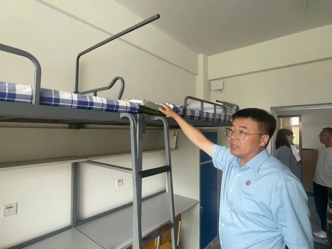 情系学生 暖心联检|学校领导走进学生社区检查指导2024级新生军训内务整理工作
