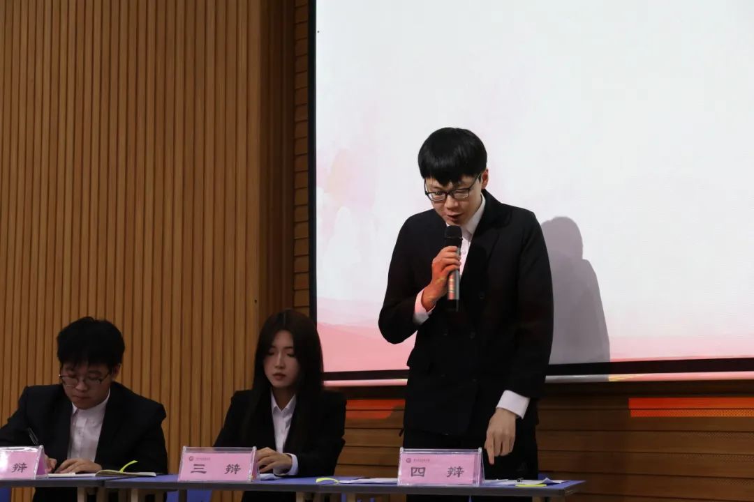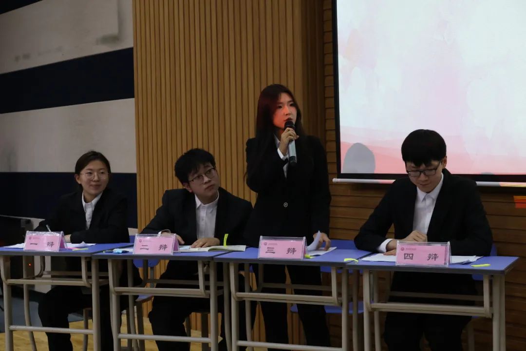 正方一辩杨佳欣同学进行开篇立论,所持观点清晰,立场明确。攻辩阶段,正方二辩刘博丰同学紧抓对方立论中的漏洞积极展开质询,展现出优秀的临场发挥能力与语言组织能力。在自由辩论环节,正方三辩袁蒙悦同学沉着冷静应对对方的提问并进行反驳。正方四辩王瀚艺同学同学总结陈词,归纳了本方的观点,回应对方质询,语言简明扼要,陈词掷地有声。每个参赛选手们都妙语连珠,引经据典,用事实和逻辑为自己的观点辩护,赢得了观众的阵阵掌声。